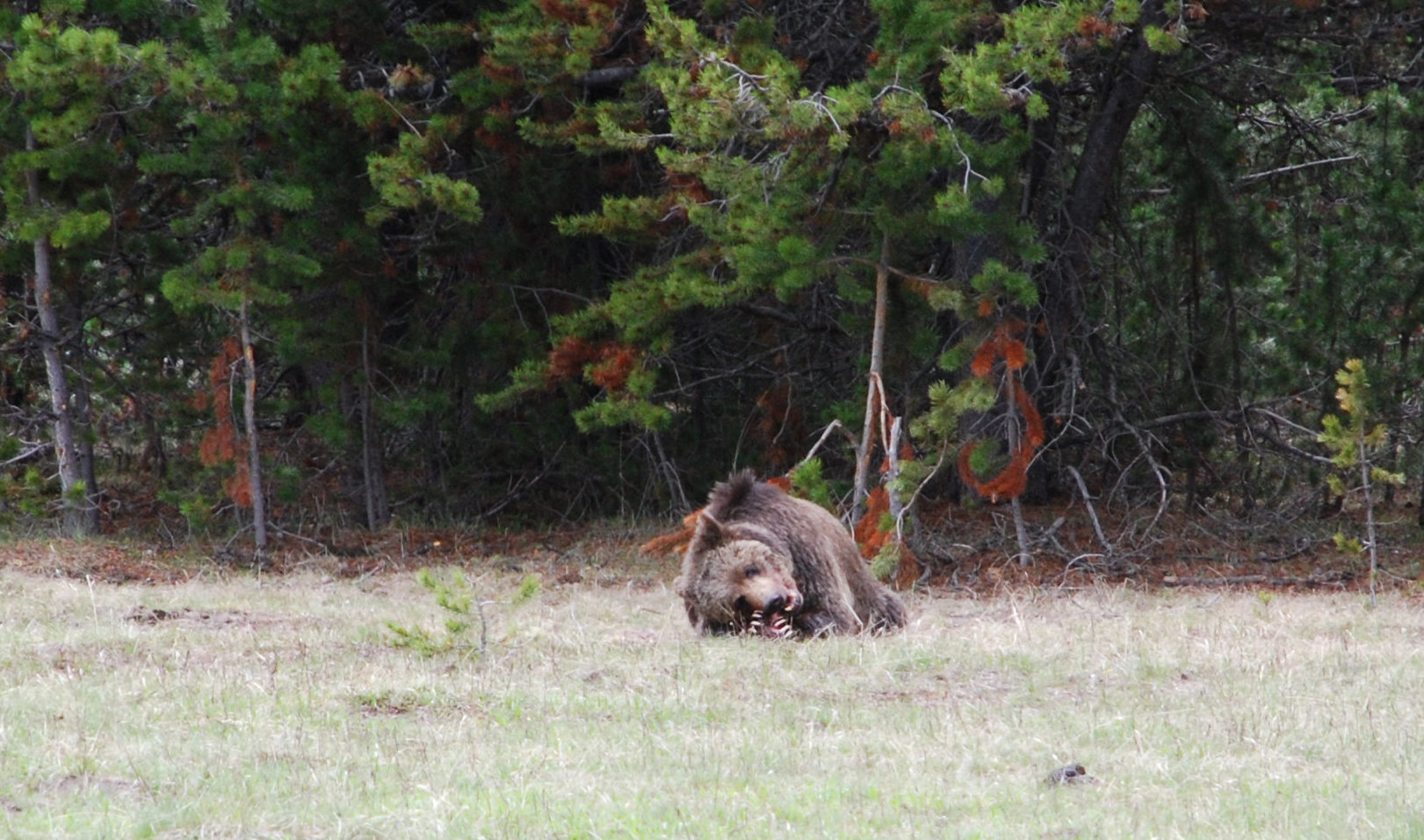 A grizzly bear chews on a chunk of elk in a meadow near Fishing Bridge in Yellowstone National Park last Thursday. (AP Photo/Powell Tribune, Toby Bonner)