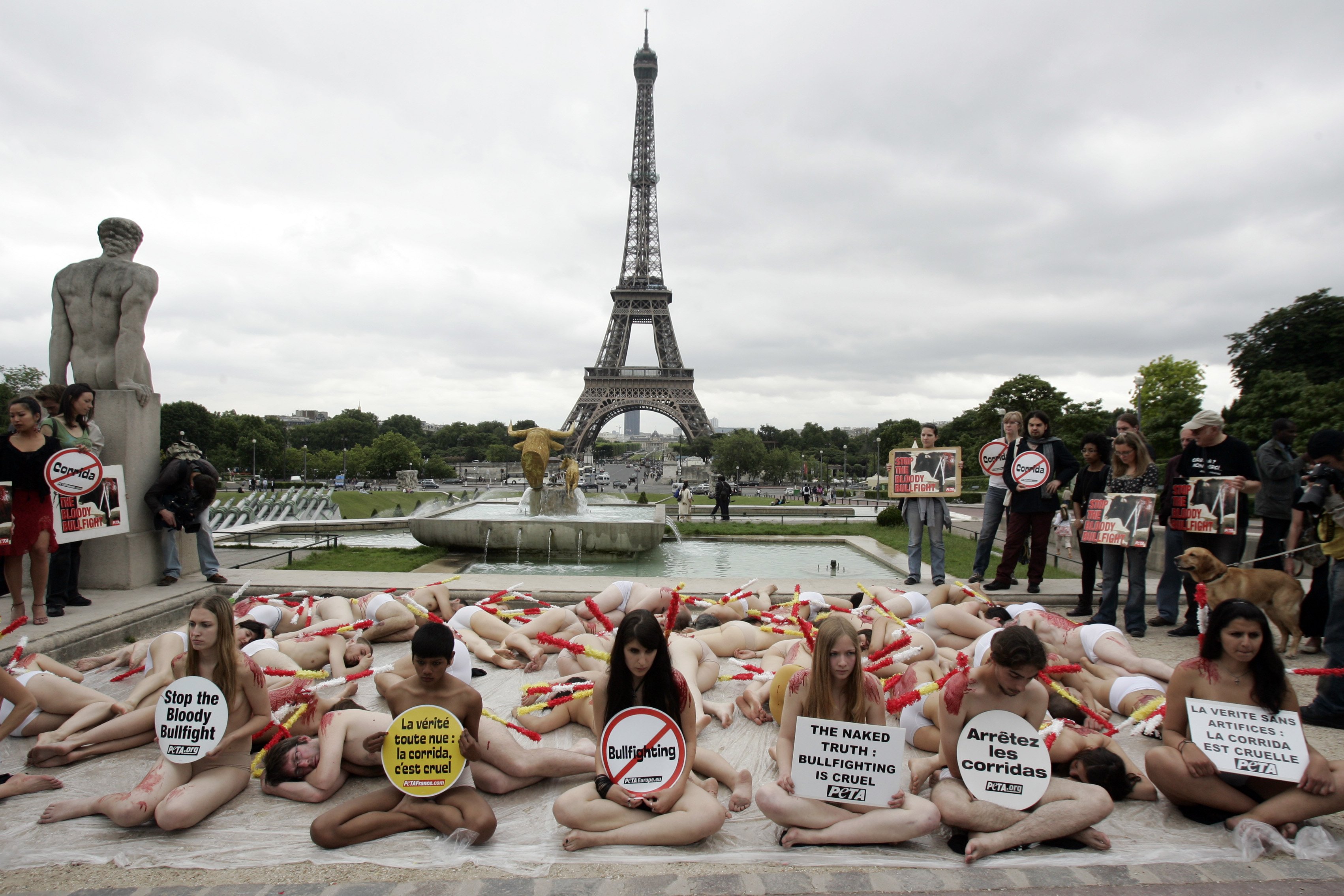 People for the Ethical Treatment of Animals (PETA) activists sit with red painting on their body to protest against bullfighting at the Trocadero near the Eiffel tower, in Paris, Thursday. You write the cutline. (AP Photo/Francois Mori)
