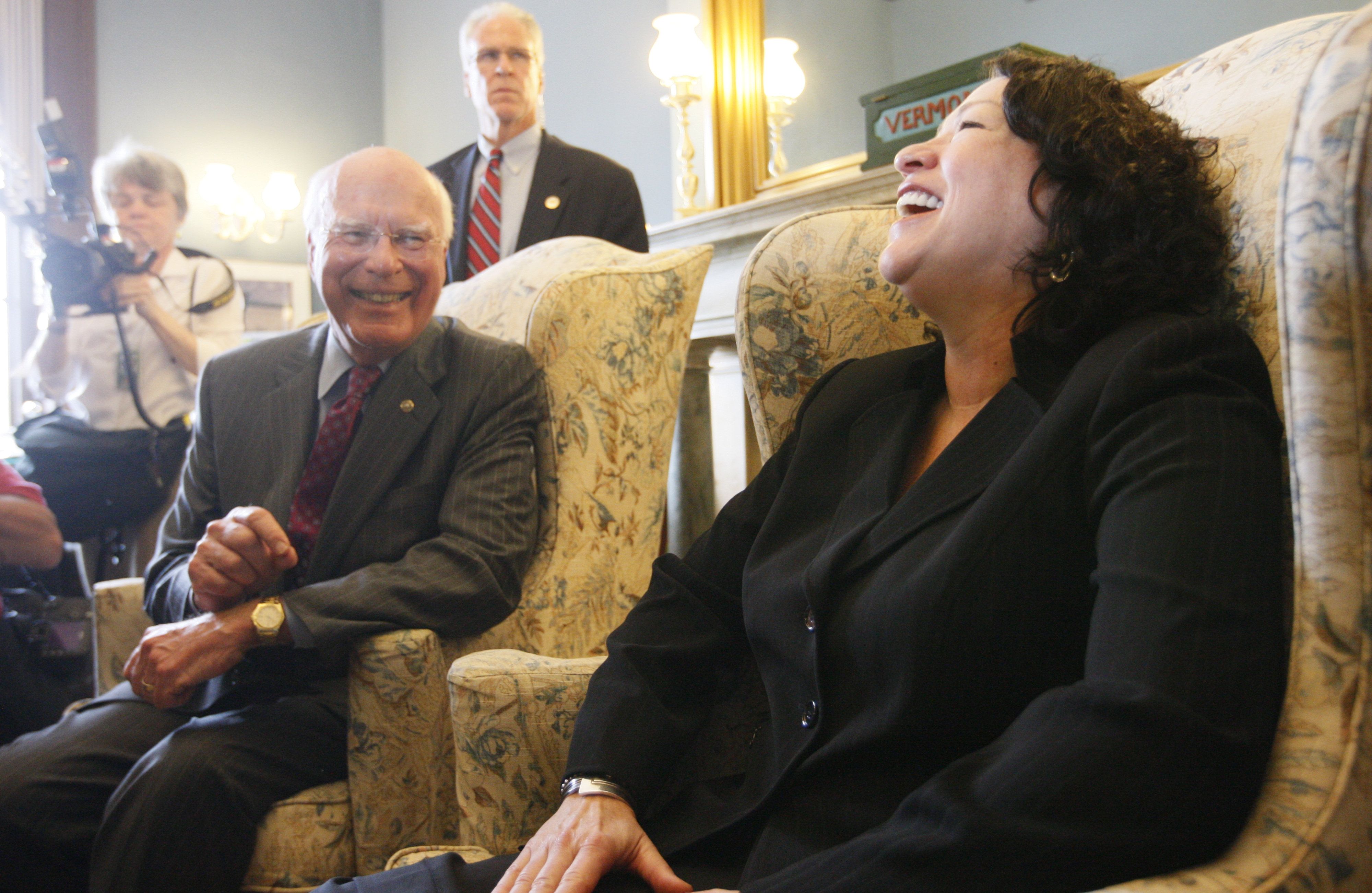 Supreme Court nominee Sonia Sotomayor laughs as she meets with Senate Judiciary Committee Chairman Sen. Patrick Leahy, D-Vt. in his office on Capitol Hill in Washington, Tuesday. Washington Post story here . (AP Photo/Charles Dharapak)