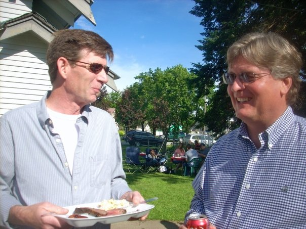 At Taryn & Bent’s BeerBQ Cookoff Saturday, ThomG, head of the local D’s, chats with local Repub official Duane Rasmussen at Taryn’s place in Spirit Lake. Which proves that free food, good homemade beer and Huckleberries Online can bring together individuals with a wide variety of socio-political views on life.