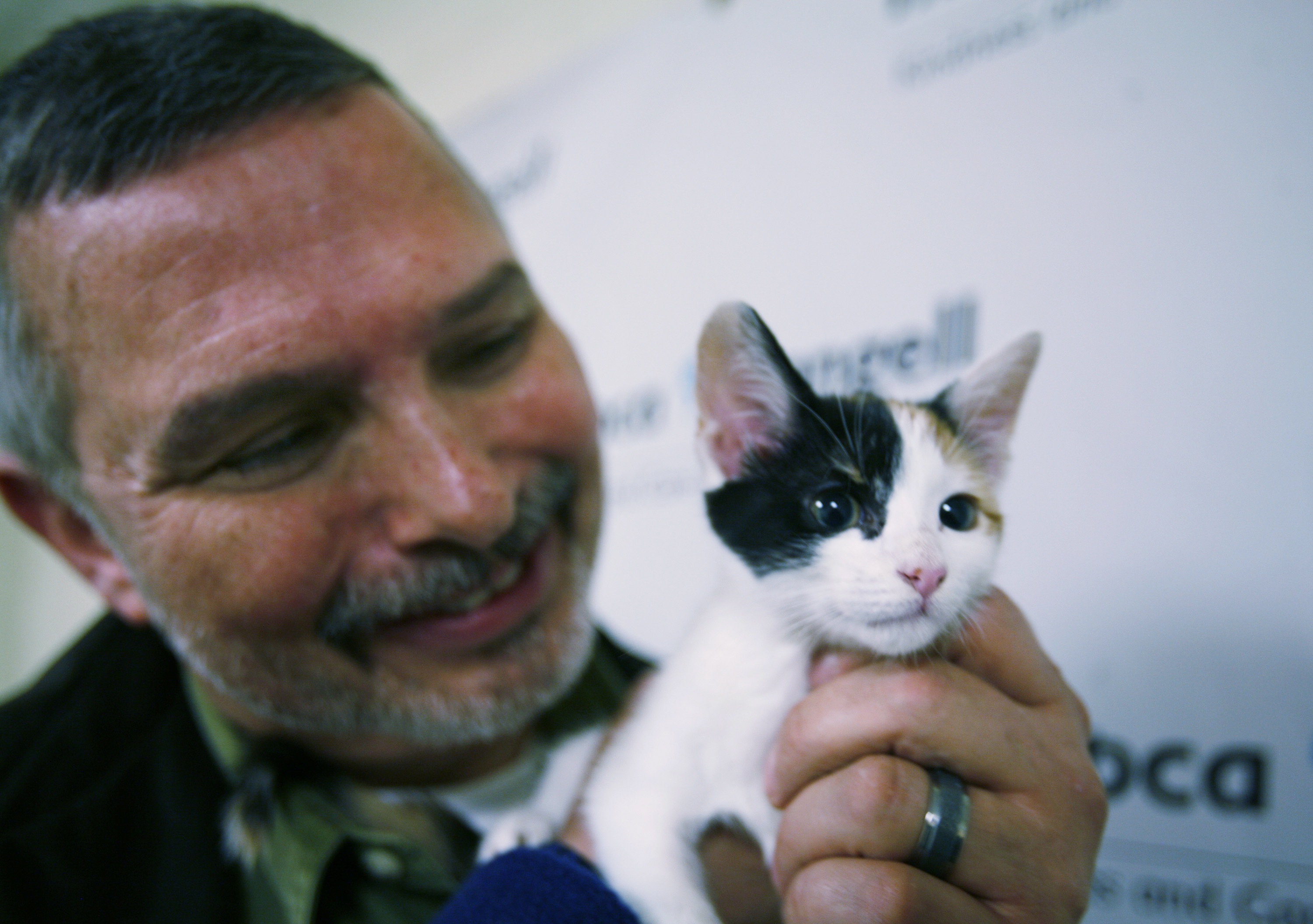 New Hampshire postal worker George Knapp shows off an 8-week-old kitten that he adopted Monday at the MSPCA in Boston. The two-pound kitten, who Knapp is naming PD for Postage Due, was abandoned in a public mailbox in Boston earlier this month. (AP Photo/Eric J. Shelton)