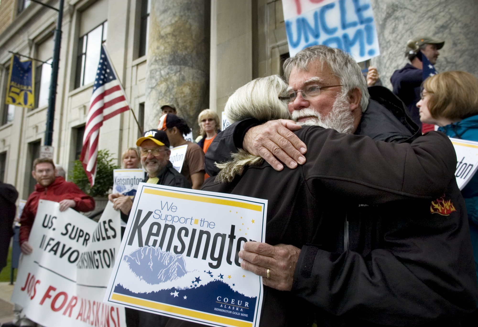 Jerry Harmon, the surface general supervisor for the Kensington Mine, receives a hug from Rep. Cathy Munoz, R-Juneau, during a lunchtime rally on the steps of the Capitol in Juneau, Alaska, on Monday, after the Supreme Court upheld the government’s decision to issue permits to use Lower Slate Lake to hold mine tailings. The Supreme Court upheld a federal permit to dump waste from the Idaho-based Coeur d’Alene Mine Co.’s gold mine into Lower Slate Lake in the Tongass National Forest, even though all its fish would be killed. Environmentalists feared the ruling could weaken protection of other lakes, streams and waterways from mining waste. (AP Photo/The Juneau Empire, Michael Penn)