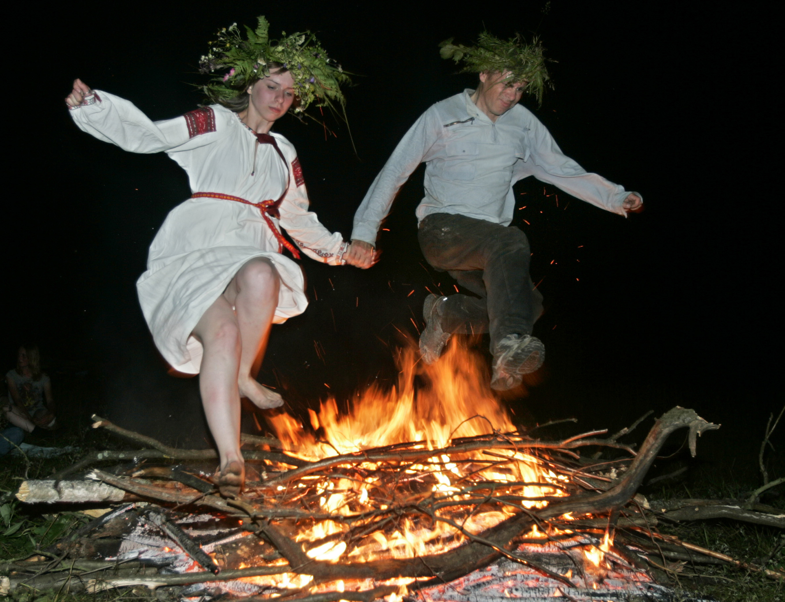 Belarusian neo-pagans jump over a bonfire celebrating the summer solstice near the town of Orsha, 200 km (125 miles) northeast of Minsk, Belarus, late Tuesday. You write the cutline. (AP Photo/Sergei Grits)