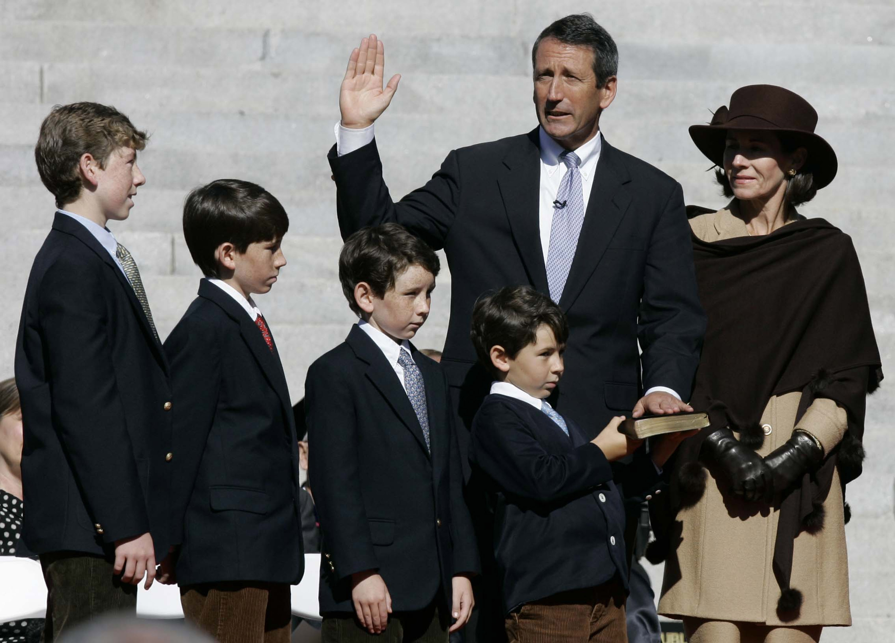 In this January 2007 file photo, South Carolina Gov. Mark Sanford takes the oath of office for a second term with his wife Jenny and sons, from the left; Marshall III; Landon; Bolton and Blake, during inaugural ceremonies at the Statehouse in Columbia, S.C. Now, Sanford has admitted admitted Wednesday to an affair , and resigned his position as chair of the Republican Governor’s Association following a strange week in which the governor dropped off the grid and could not be located. Story here . (AP Photo/Mary Ann Chastain, File)