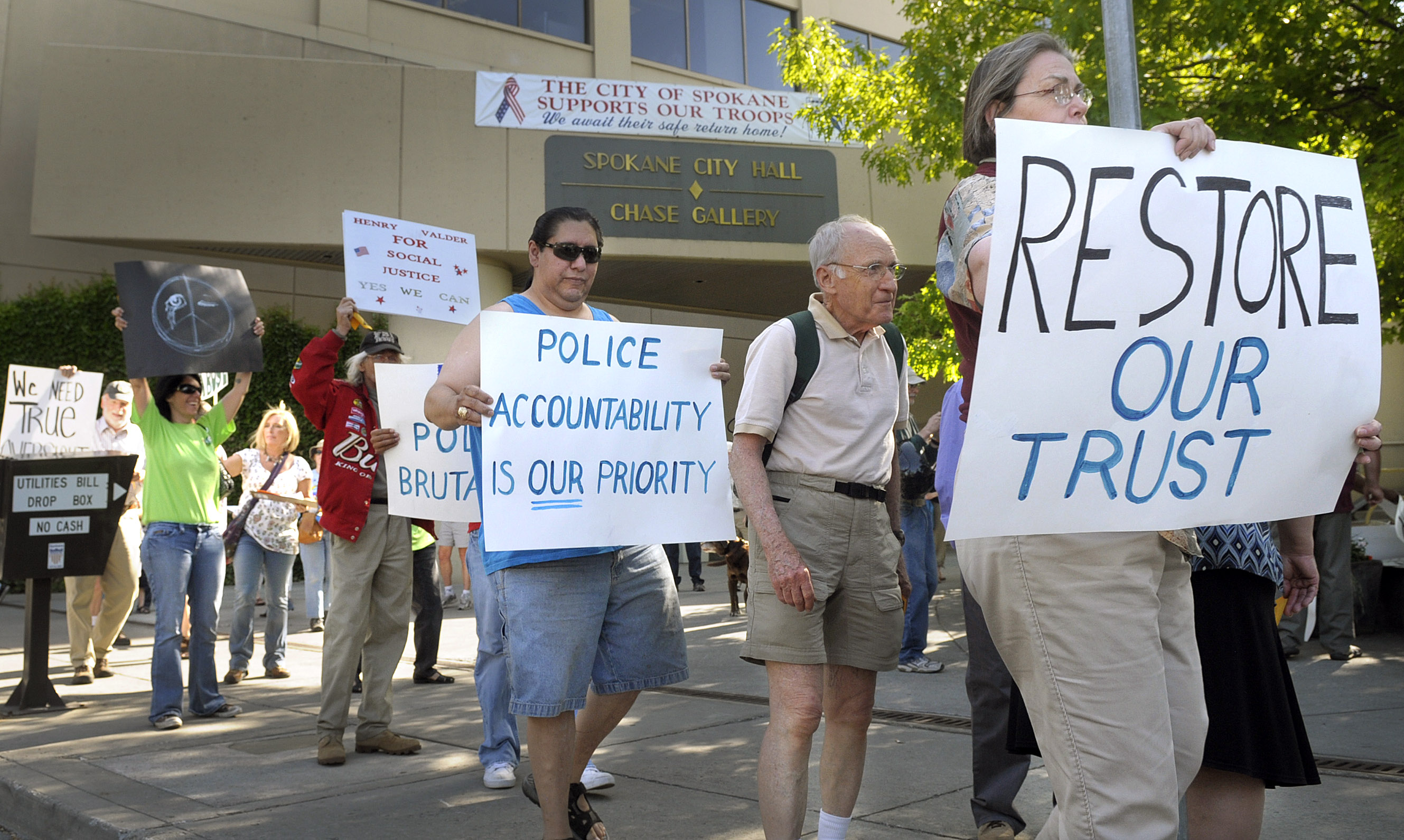 Protestors march in front of Spokane, Wash. City Hall Thursday to raise awareness over their concerns for an independent police ombudsman. (Christopher Anderson/SR)