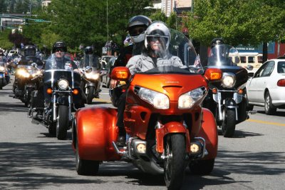 “Over 100 motorcycles paraded through Coeur d’Alene Thursday morning as members of Cal-Tex Riders took to the streets,” posts Councilwoman KerriT/OnLocation North Idaho. “The organization of retired law enforcement officers is in North Idaho for a convention. John Skeete of California drives a gorgeous orange Goldwing trike in the procession.”