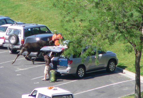 Don Sausser, HBO’s Eye On Sherman Avenue, spotted this unusual site @ Independence Point two hours ago — a moose that was wandering across the parking lot.
