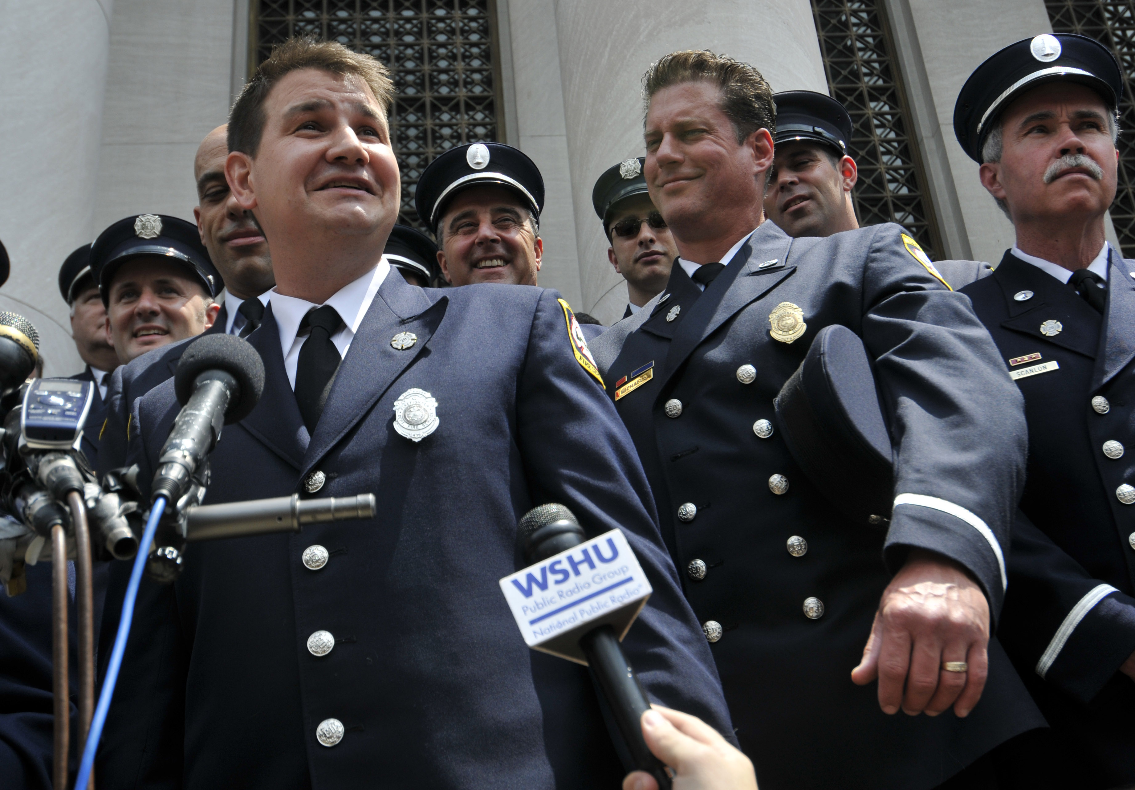 Frank Ricci, left, lead plaintiff in the the “New Haven 20” firefighter reverse discrimination case speaks to the media outside of Federal Court in New Haven, Conn., today. The Supreme Court ruled in a 5-4 decision that white firefighters in New Haven, Conn., were unfairly denied promotions because of their race, reversing a decision that high court nominee Sonia Sotomayor endorsed as an appeals court judge. More here . (AP Photo/Jessica Hill)