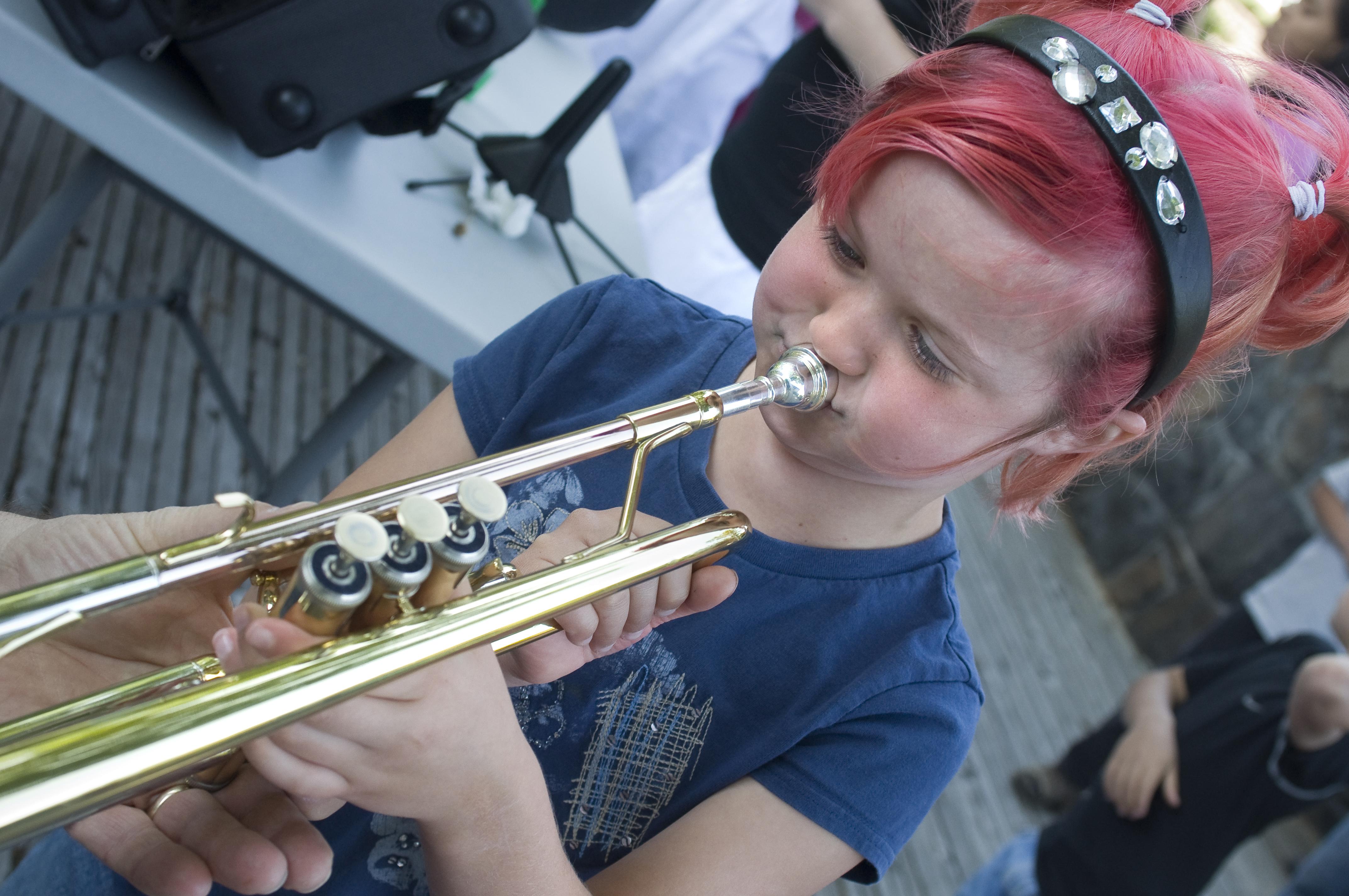 Brianna Webber puffs out her cheeks as she tries to get a first note out of a trumpet during an event at The Dalles Wasco County Library in The Dalles, Ore. Kids had an opportunity to experience drums, trumpets, saxophones, flutes and other instruments, and make some of their own. (AP photo/The Dalles Chronicle, Mark B. Gibson)