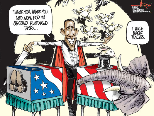 In this morning’s David Horsey cartoon we have the famous Obama Magic Show, featuring adulations by the Democrats and starring Humpty Dumpty as The Republican Party. The real question remains to be seen whether the Republican Party will be able to put itself back together again, isn’t it?