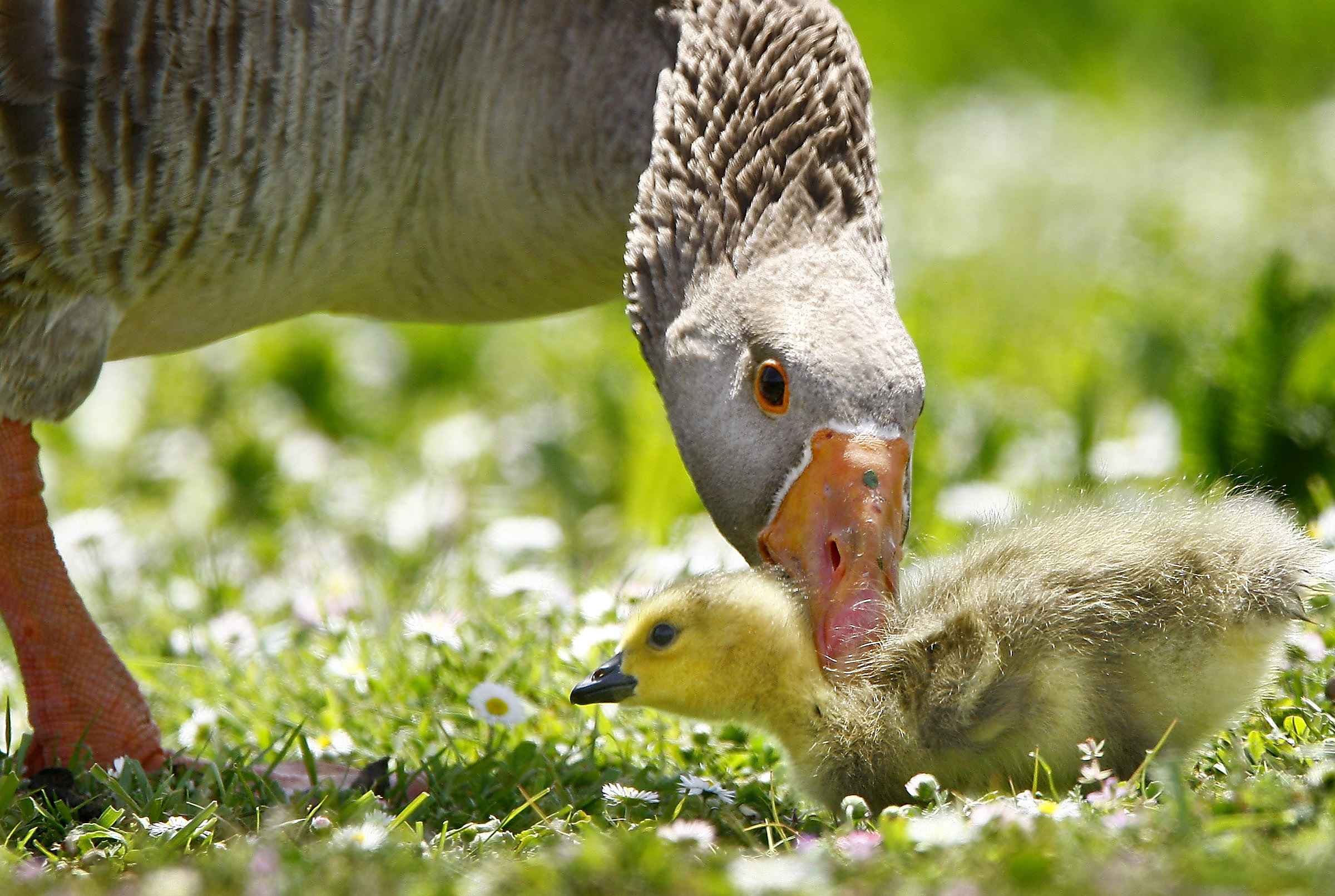 An adult goose bites the neck of a gosling today near the Stewart Park duck pond in Roseburg, Ore. The little one appeared uninjured by the bite. (AP Photo/The News-Review, Robin Loznak)