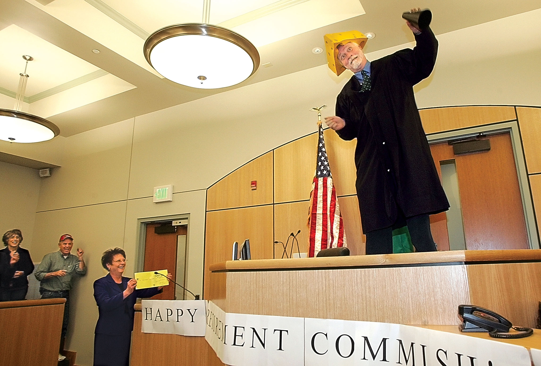 Benton County Court Commissioner Bill Platts dances on the bench of his courtroom Thursday in Kennewick, Wash. making good on a promise he made to defendants that if they got their high school diploma or GED, he would dance on the courtroom bench during his retirement party. For 25 years, Commissioner Bill Platts sat behind the Benton County District Court bench, doling out advice and punishment to shoplifters, speeders and teens caught with alcohol. You write the cutline. (AP Photo/Tri-City Herald, Richard Dickin)
