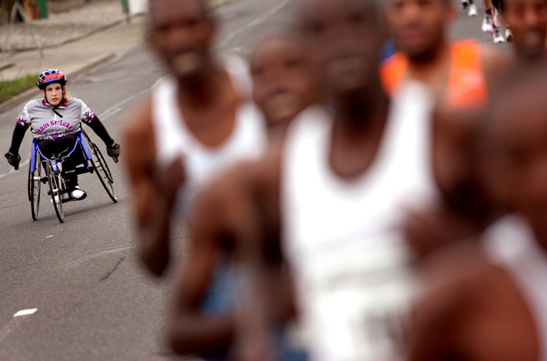 A wheelchair racer watches as the pack of Elite Men racers pass during Bloomsday in Spokane, Wash. (Rajah Bose/The Spokesman-Review)