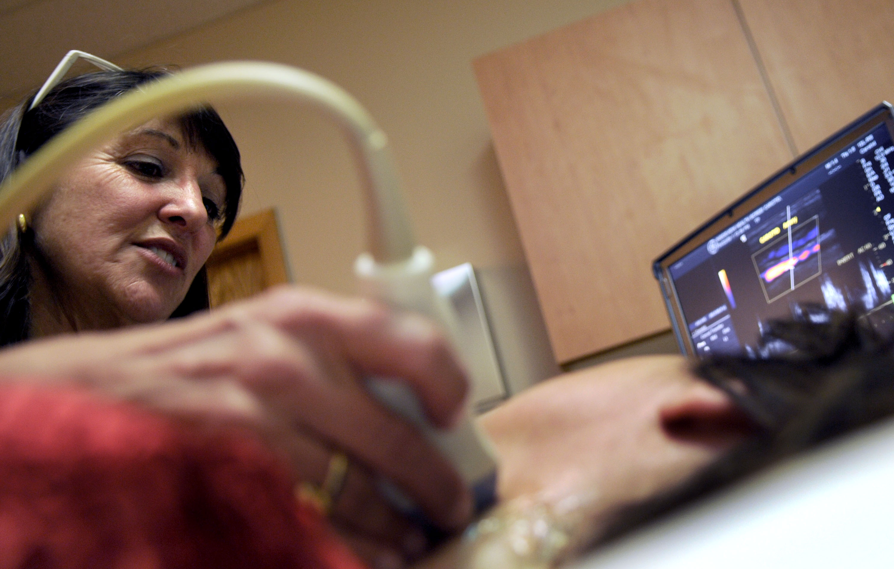 Terri Porcarelli, a Registered Diagnostic Medical Sonographer, works with a patient on Wednesday. She has started a new business, Inside View Health Screening. Story here . (Kathy Plonka/Spokesman-Review)