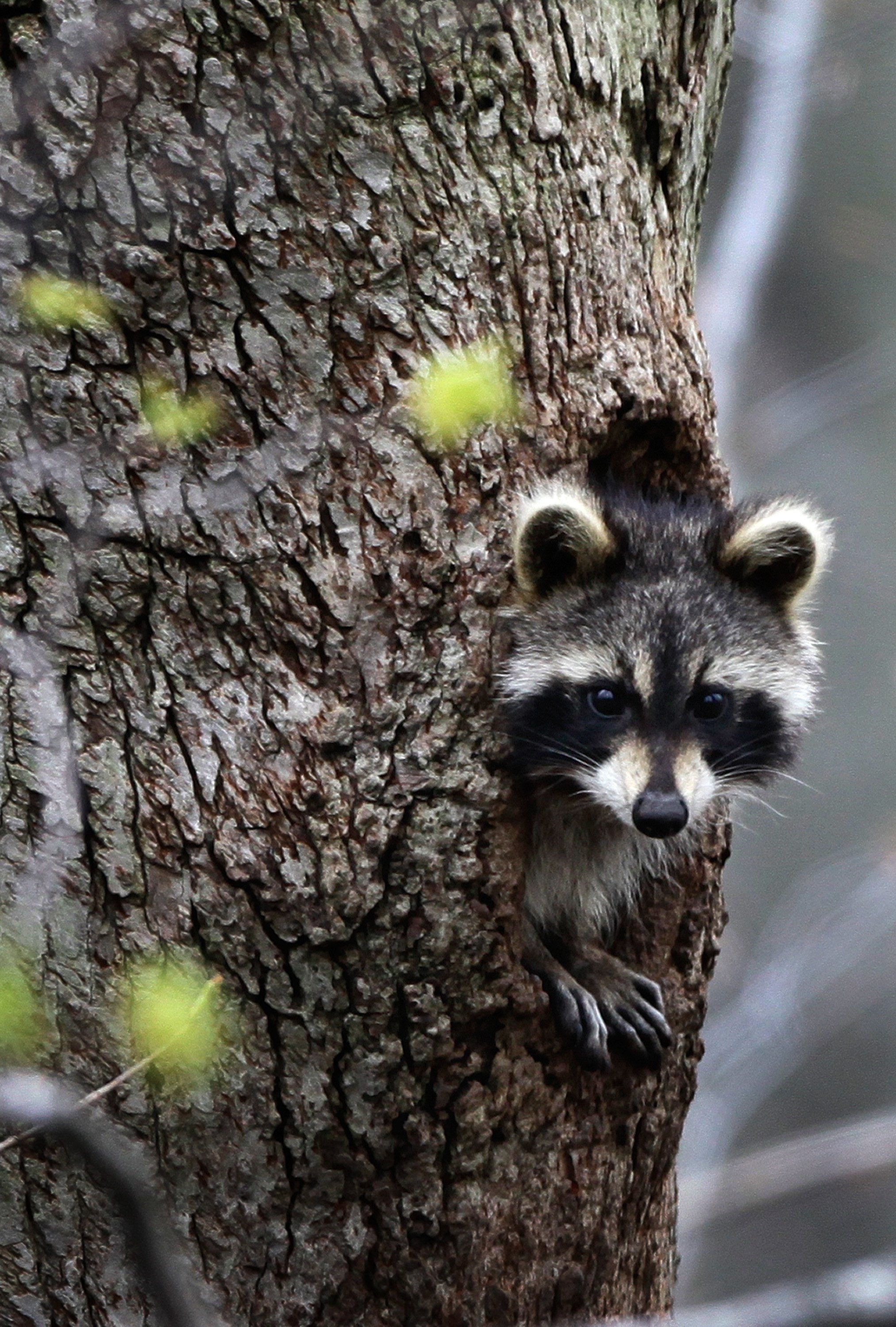 A raccoon peers out from a hole in a tree in a ravine in Moreland Hills, Ohio recently. (AP Photo/Amy Sancetta)