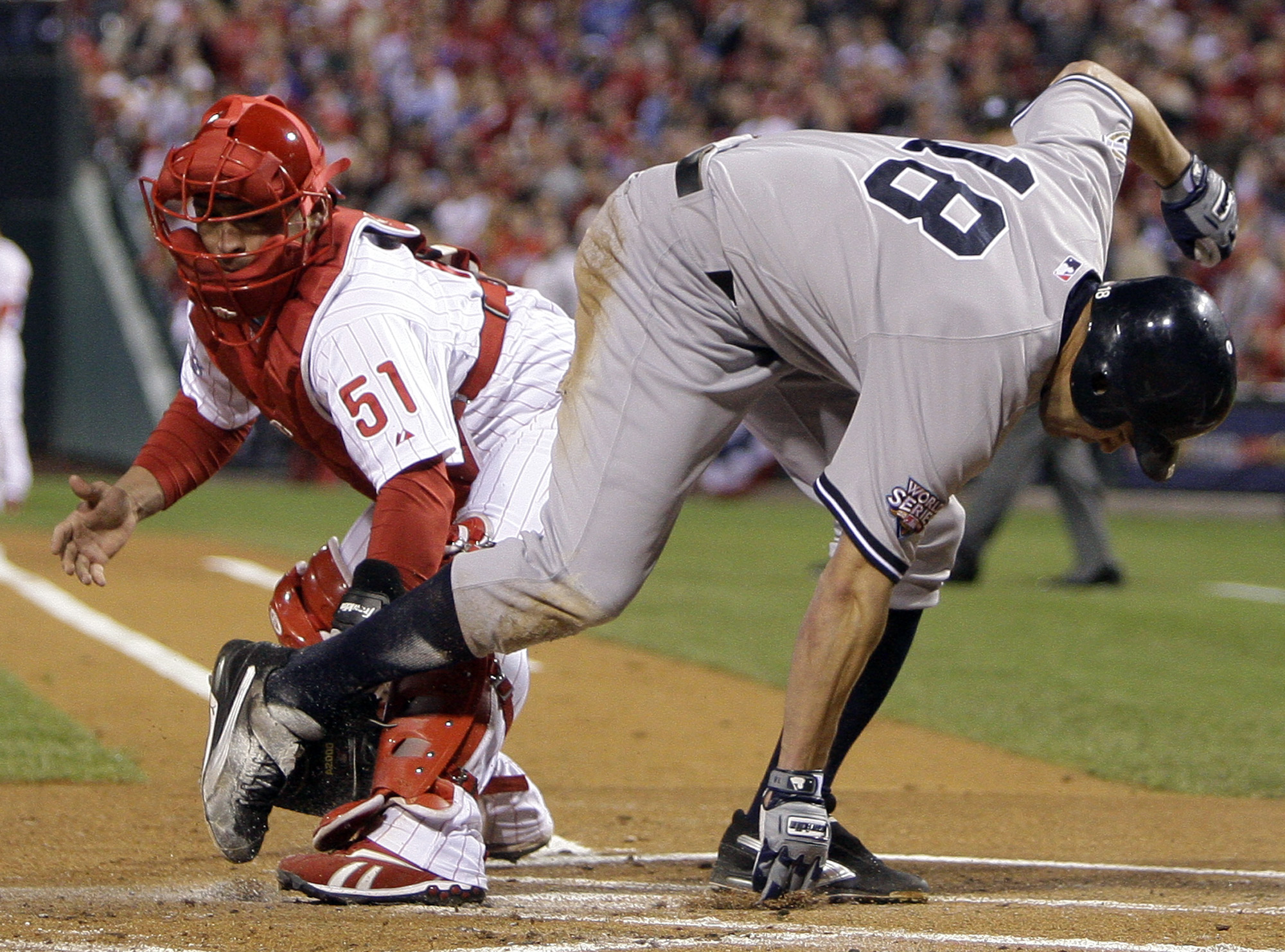 New York Yankees’ Johnny Damon slides safely past Philadelphia Phillies catcher Carlos Ruiz during the first inning of Game 5 of the Major League Baseball World Series tonight in Philadelphia. Damon scored on a hit by Alex Rodriguez. The Phillies beat the Yanks 8-6. Game recap here . (AP Photo/Matt Slocum)