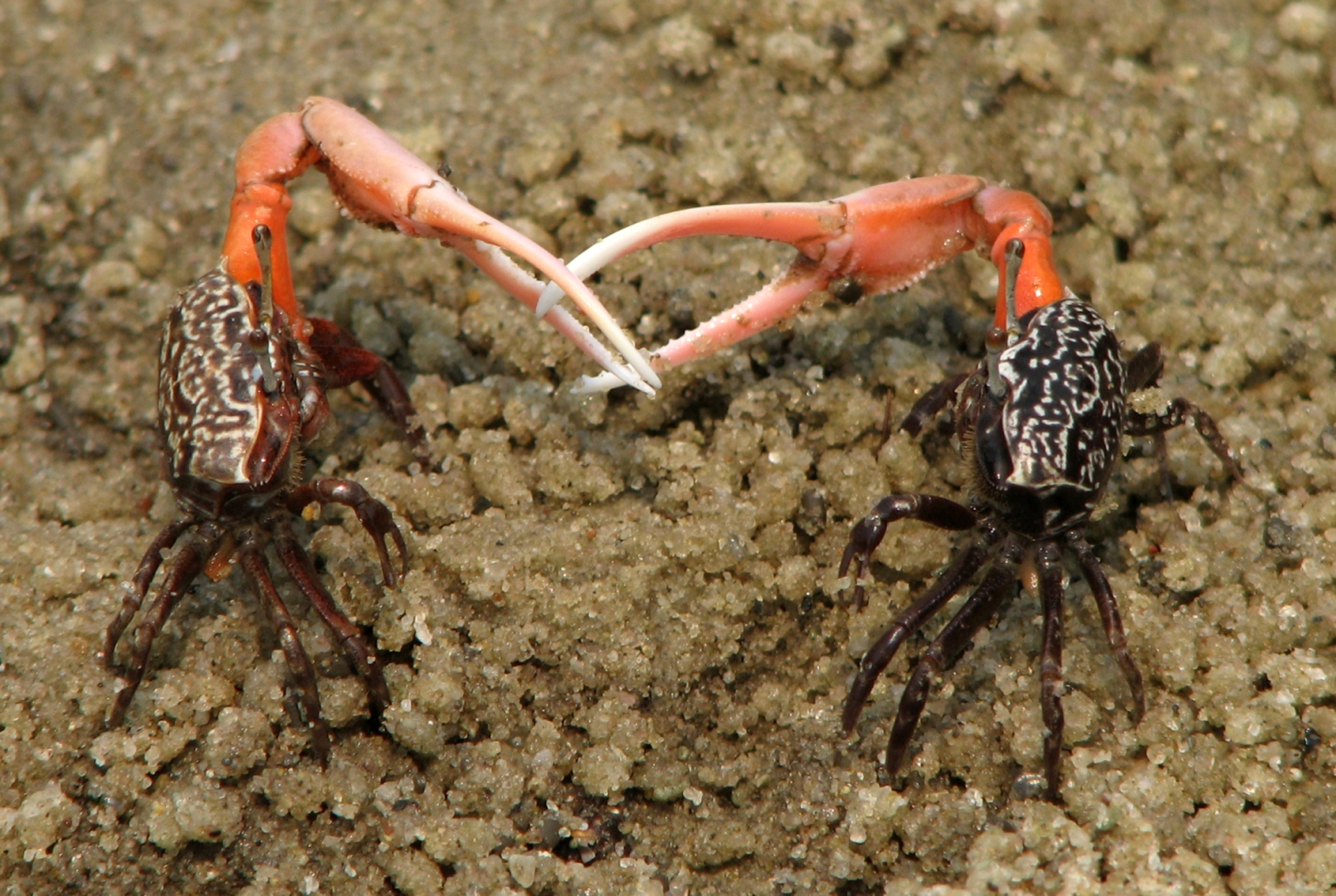 Two male fiddler crabs fight on a beach on Inhaca Island, Mozambique. Researchers from The Australian National University in Canberra found that male fiddler crabs will happily defend a female neighbor against intruders, partly because the females will dole out sex in return, according to the Australian study published today. You write the cutline. (AP Photo/The Australian National University, Tanya Detto)
