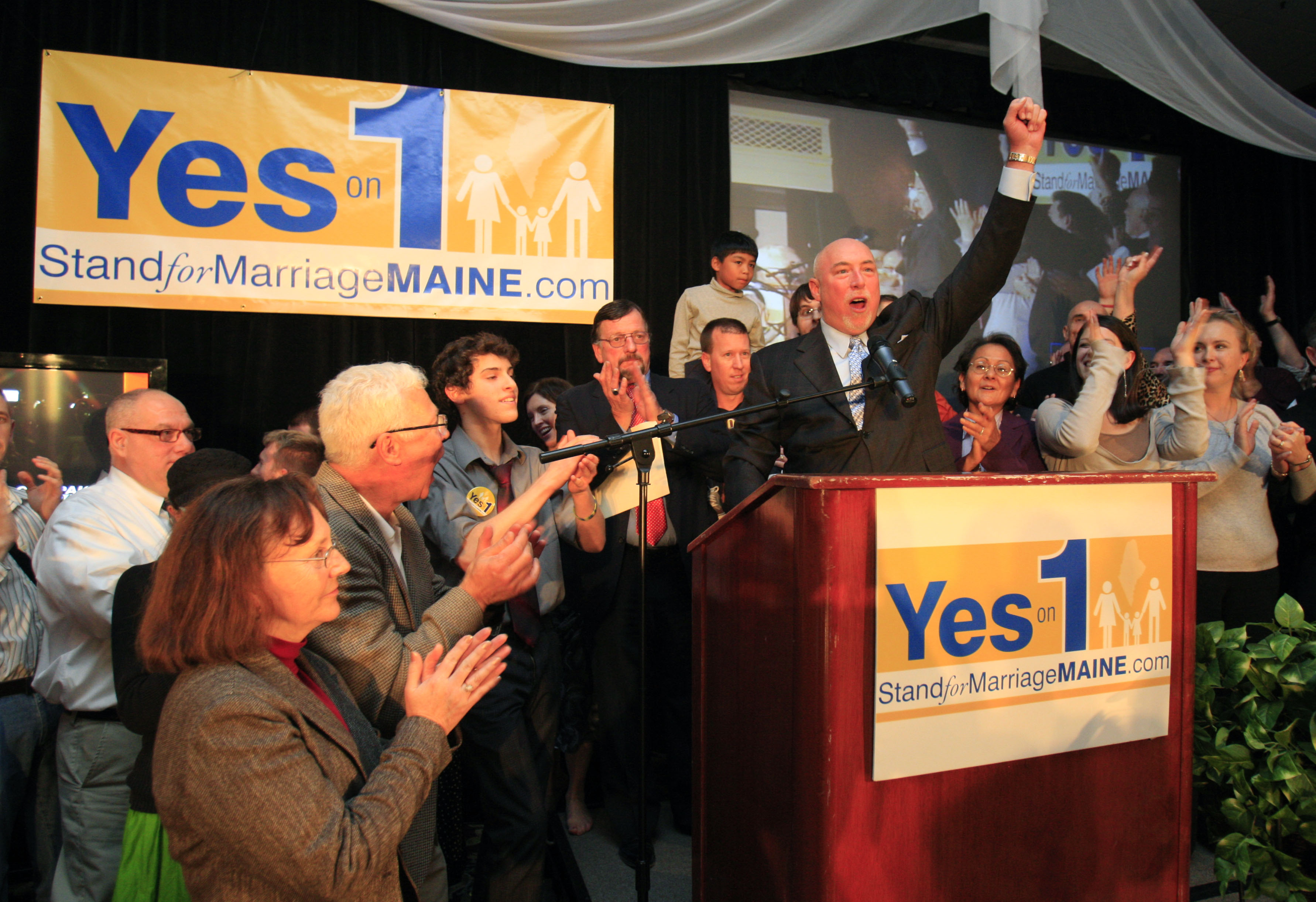 Frank Schubert, campaign director for Stand for Marriage Maine, claims victory for Yes on 1, Tuesday evening in Portland, Maine. Question 1 was the proposal to rescind the Legislature’s approval of same-sex marriage. (AP Photo/Robert F. Bukaty)