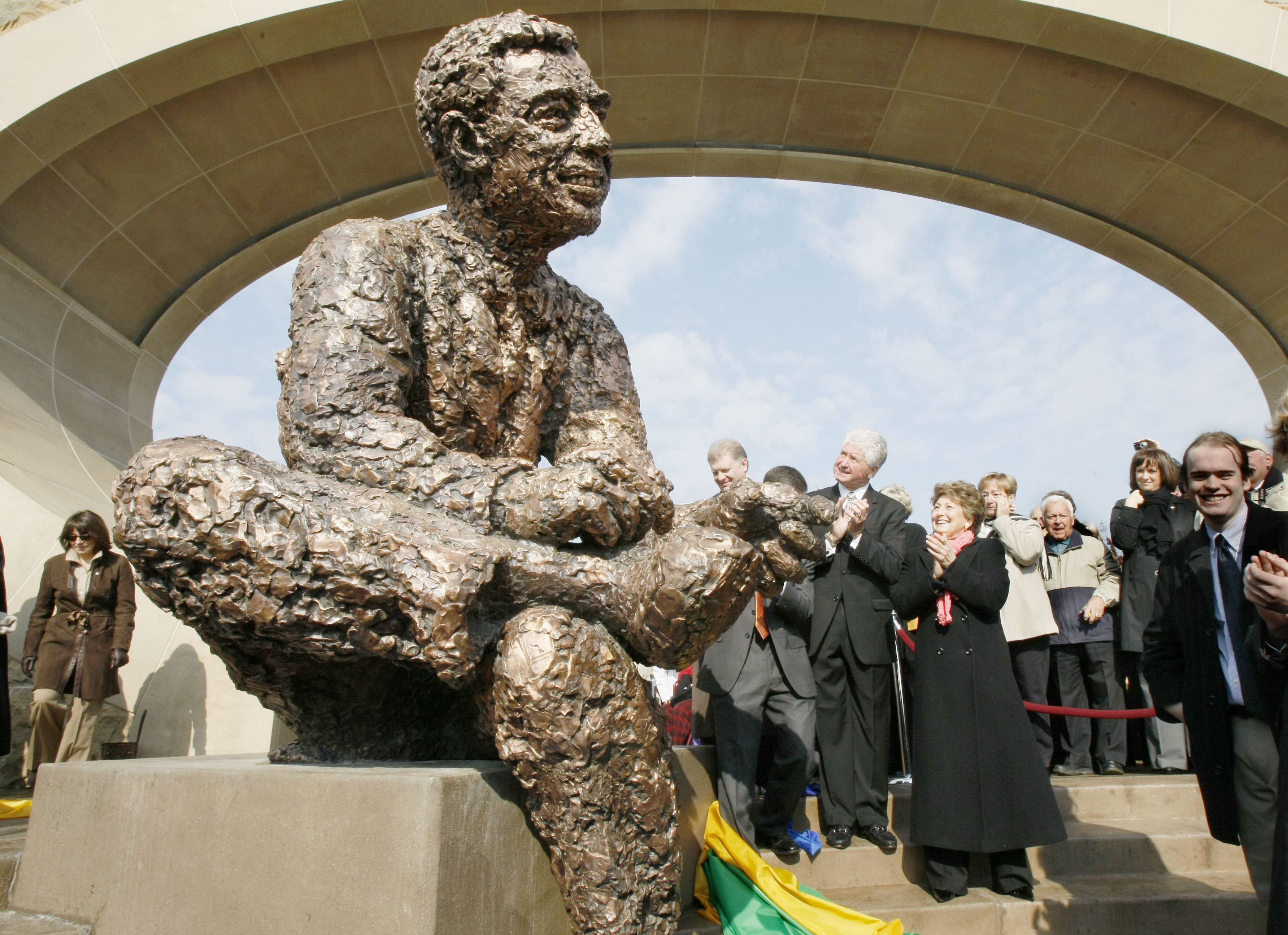People attending the dedication applaud the unveiling of the statue of the late Fred Rogers of the PBS television program “Mr. Rogers Neighborhood” in Pittsburgh, Thursday. The statue by renowned sculptor Robert Berks depicts the children’s television pioneer changing his shoes as he had done in the beginning of his show. (AP Photo/Keith Srakocic)