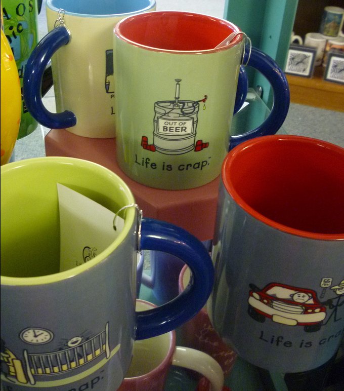 Tricia Jo Webster /Fabulocity writes: “I found this “Life is Crap” cup during my inaugural visit to Halpin’s, one of the Valley’s hidden treasures. OK, really – sitting prominently on the corner of Bowdish and Sprague with a sign that can be seen from space without a telescope – it’s not all that hidden … I’d simply never before taken the time to stop in. I’d heard the place mentioned in conversation. I’d driven past it at least 1,037 times. But last week I stopped a lady to ask her where she’d gotten her purse – a strappy black bag weaved from seat belts, very cool – and she said “Halpin’s.” That did it. It was time for a visit.” More here .