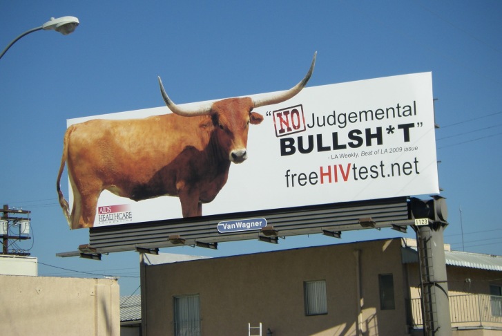 In a billboard campaign targeting the Los Angeles area, the AIDS Healthcare Foundation is promoting HIV testing with this life-sized bull, complete with tail and antlers, along with the slogan “No Judgemental Bullsh*t” and the website www.freeHIVtest.net. The campaign is aimed at taking the stigma out of AIDS testing — and fear that ” that someone is going to probe into their personal habits and judge them for it.” You can read all about it here .