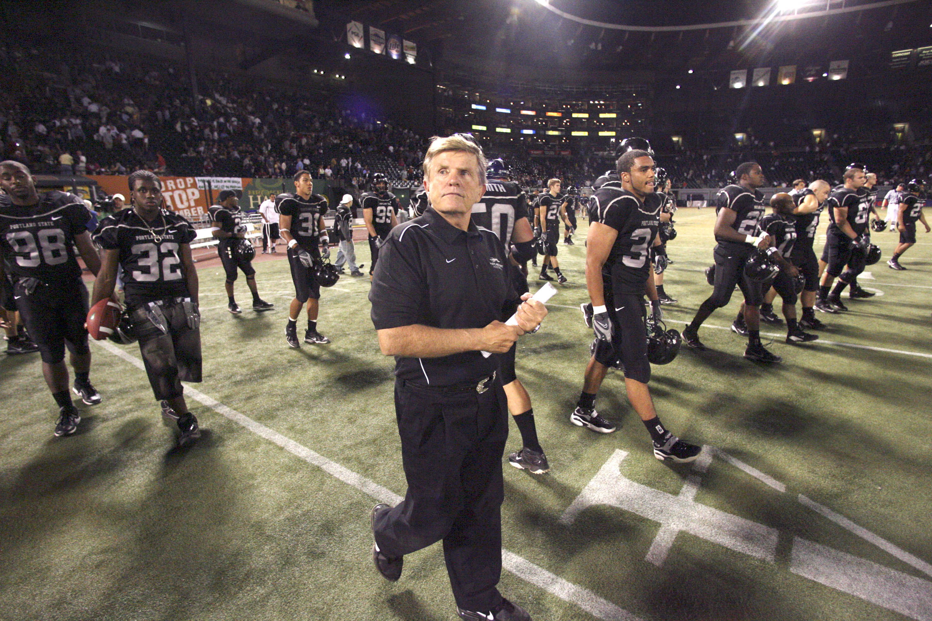 In this 2007 file photo, Portland State coach Jerry Glanville walks off field with his players after a 26-17 loss to UC Davis in an NCAA college football game in Portland, Ore. Glanville resigned today, after three years as head coach of the Portland State. (AP Photo/Rick Bowmer, File)