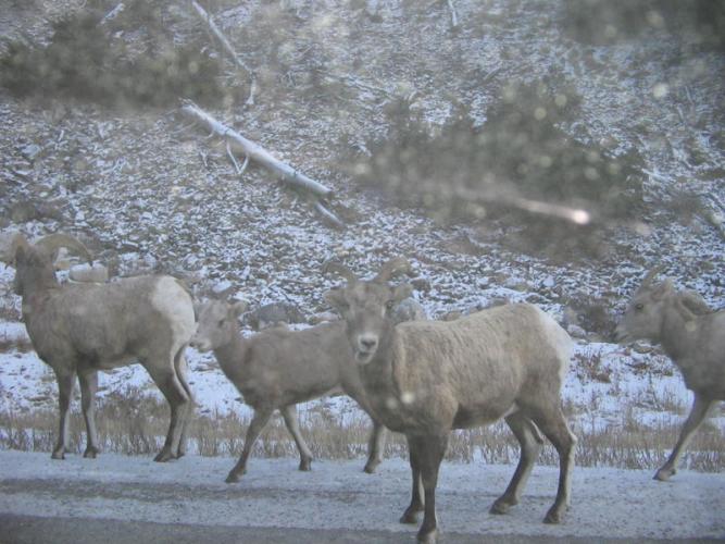 Soaf tells Huckleberries Online that “I was on my way down to La Barge WY yesterday. As I was headed through the Hoback River Canyon South of Jackson WY, I came around a corner on the highway and was greeted with the critters in the attached pics standing in the middle of the road. This pix of a ewe standing (only fee) from my vehicle.”