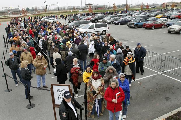 People carrying their copies of the former GOP vice presidential candidate Sarah Palin’s book, “Going Rogue,” wait in line Thursday morning at the Borders Bookstore in Noblesville, Ind., for a chance to see Palin during her book signing.