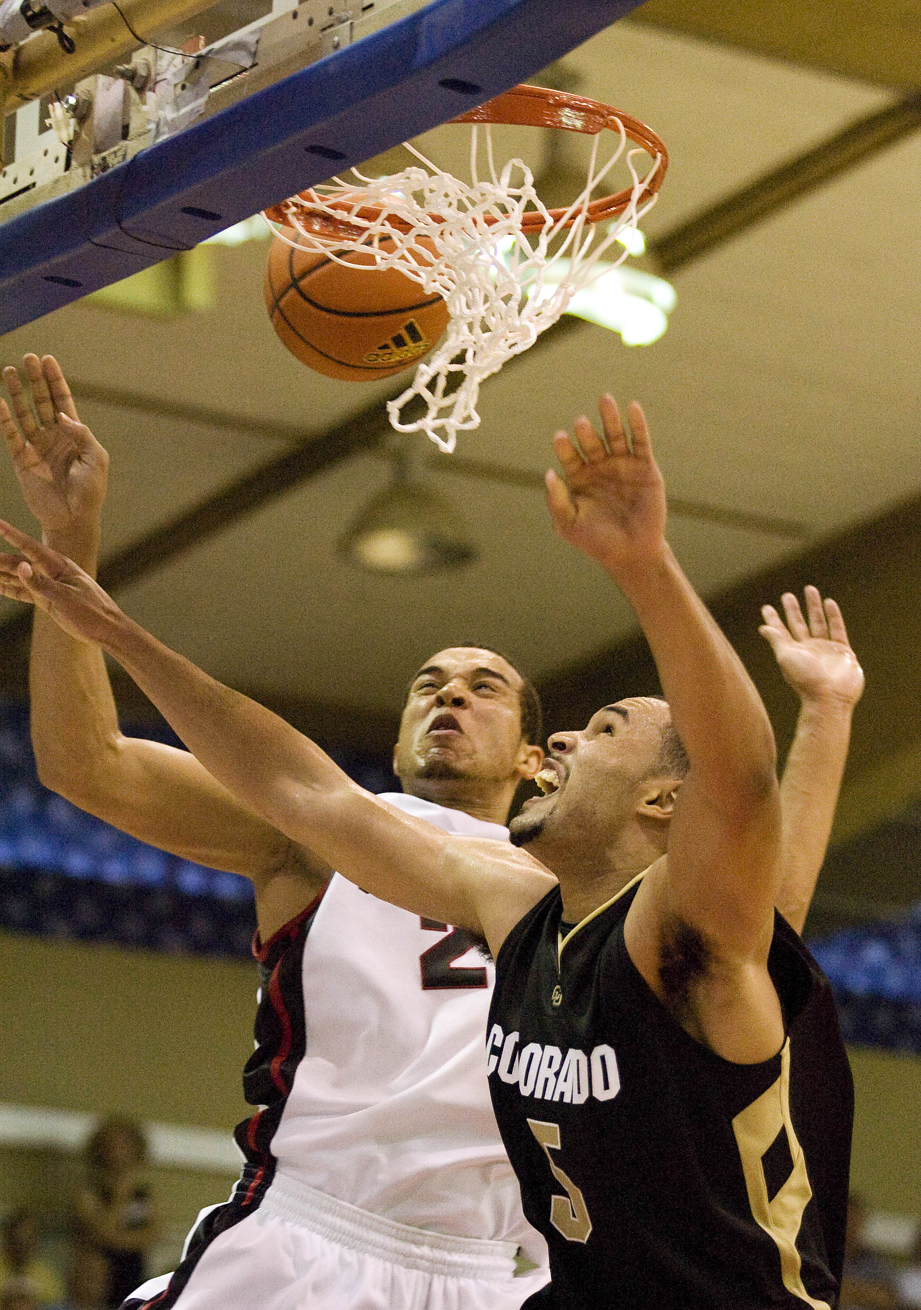 Colorado forward Marcus Relphorde (5) has his shot blocked by Gonzaga forward Elias Harris (20) in the second half in their game at the Maui Invitational NCAA college basketball tournament on Monday. Gonzaga defeated Colorado 76-72. You can read Jim Meehan’s Sportslink game story here . And: ESPN game story here . (AP Photo/Eugene Tanner)