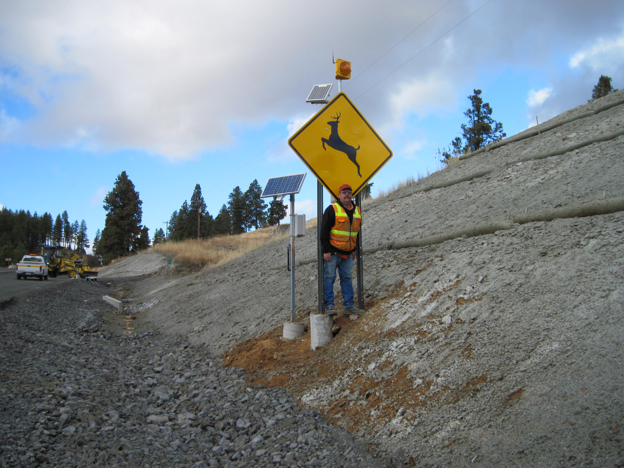 Mike Cameron, an Idaho Transportation Department inspector, stands next to newly installed system to warn motorists when wildlife wander across U.S. Highway 95 at Moscow Mountain four miles north of Moscow. The solar-powered system sets off the flashing beacon when wildlife move through an infrared beam. (Photo by Joe Schacher/ITD)