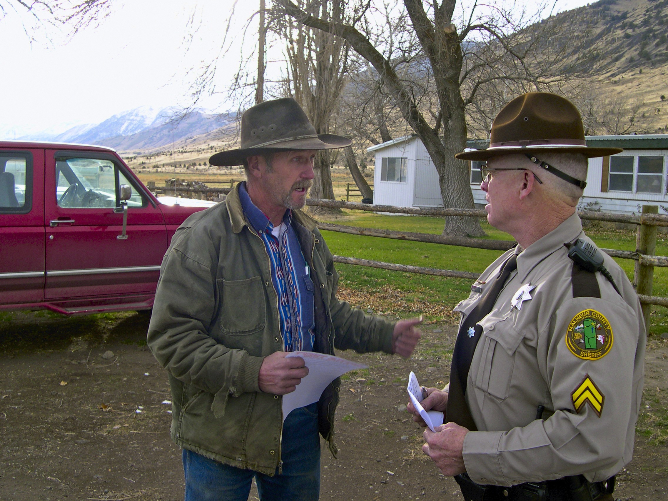 Duane Neuschwander foreman of the isolated Juniper Ranch on the boundary of Malheur and Harney counties in Oregon, talks to Malheur County Deputy Bob Wroten about the disappearance of 33 cattle. A rash of horseback rustling in the vast “ION country,” where Idaho, Oregon and Nevada come together, has prompted reward posters and patrols by sheriff’s deputies and ranchers. (AP Photo/Richard Cockle/The Oregonian)