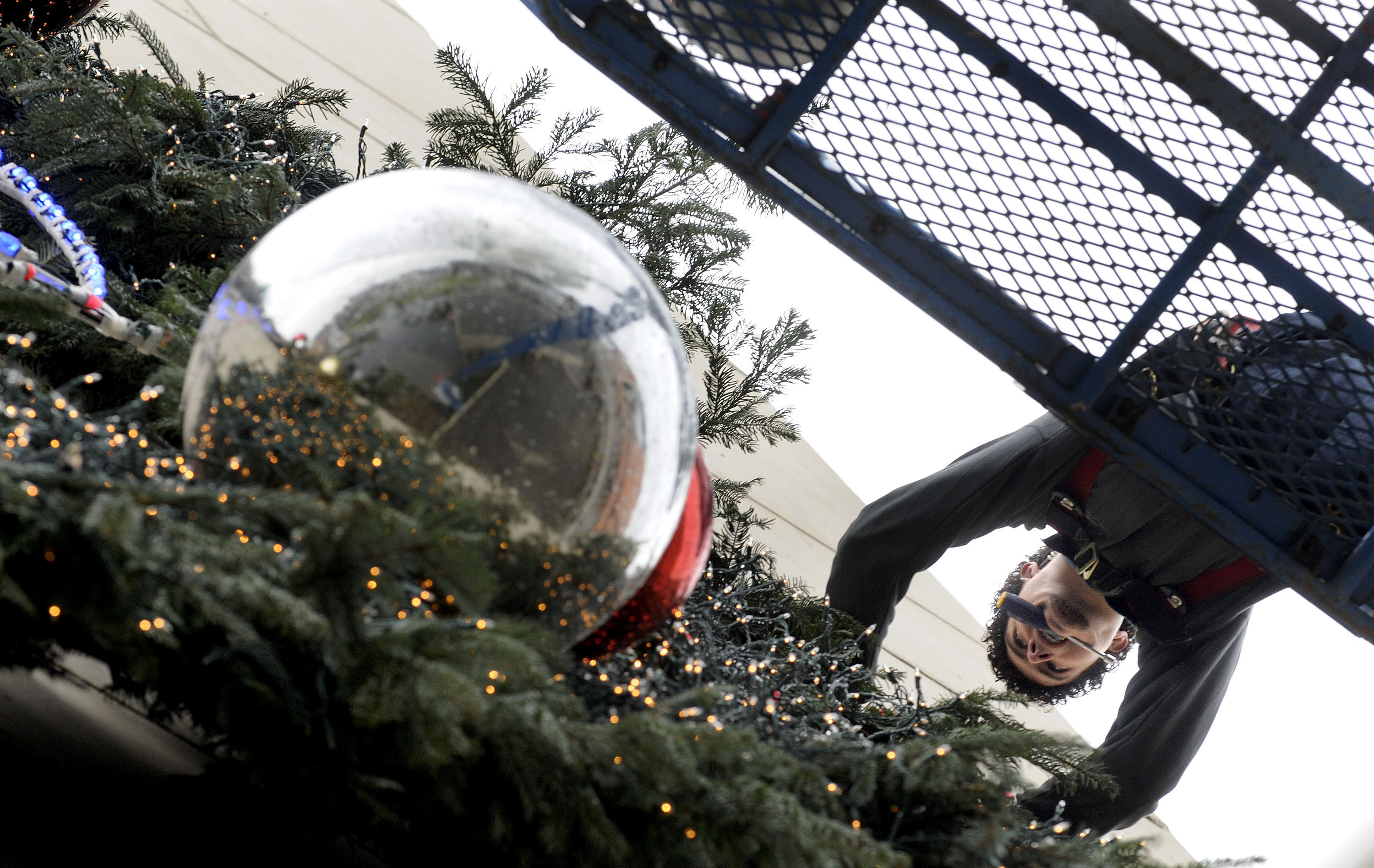 Kyle Olivier, engineer for the Coeur d’Alene Resort worked on the holiday wreath earlier today in preparation for the downtown parade and fireworks show on Friday.The wreath, a tradition since the remodeled Resort opened in 1986, weighs almost a ton. Alison Boggs’ story here . (Kathy Plonka/SR)