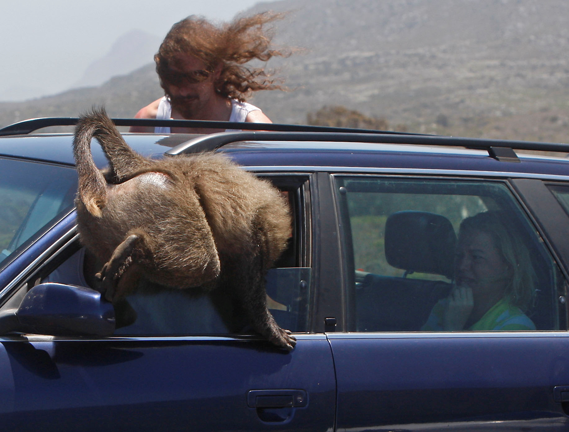 A baboon seen as it climbs inside a car at Cape Point on the outskirts of Cape Town, South Africa, Tuesday. You write the cutline. (Photo/Schalk van Zuydam)