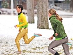 gold pants and a cropped gold shirt, is running flat-out through Comstock Park. He’s moving fast through a mob of teenagers in robes and wigs and wild face paint. Blake Bekken and Annie Pokorny are on Parker’s heels, sprinting too, but a bit awkwardly – not because they aren’t good runners, but because they’re clutching broomsticks between their legs. Besides, there’s snow on the ground — a thin, slushy layer that makes traction unpredictable. Parker hops, veers right, then left, then veers onto the basketball court. This is a safe zone: Blake and Annie have to let him go, but they don’t take their eyes off him. Parker is the Golden Snitch. Blake and Annie are the Seekers whose job is to catch him/