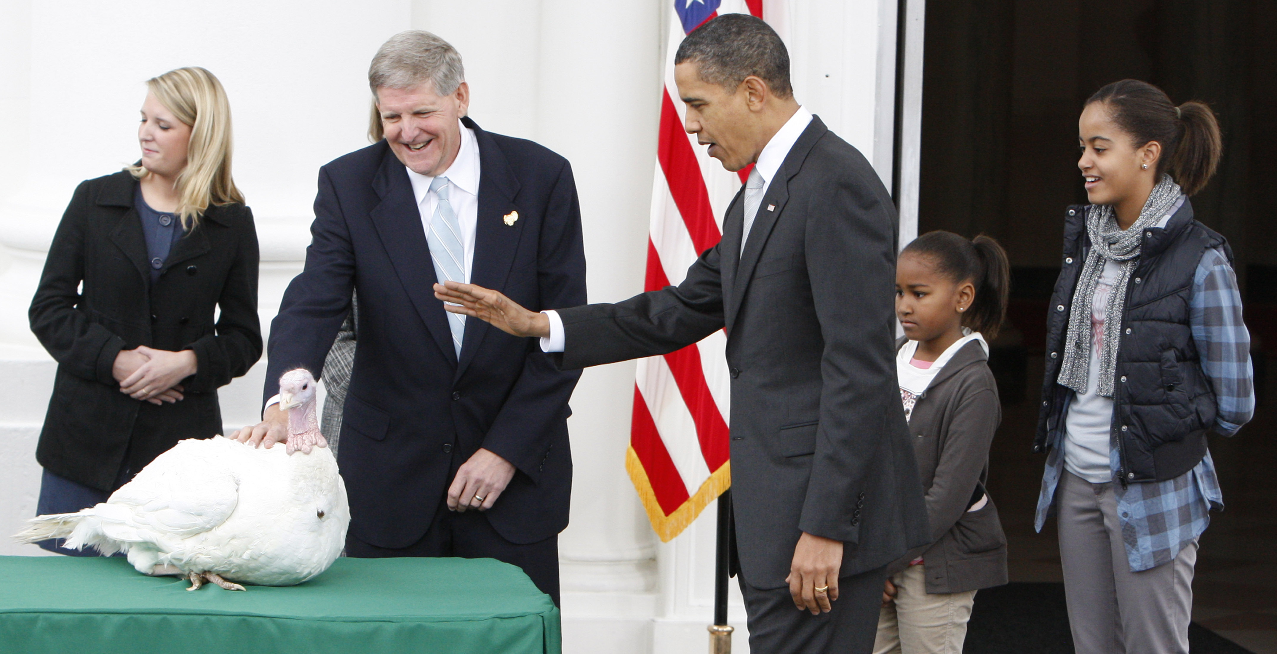 President Obama, center, with daughters Malia, far right, Sasha, second from the right, pardoning the National Thanksgiving Turkey, Courage, in a ceremony in the North Portico of the White House, in Washington, Wednesday. With Obama is the Chairman of the National Turkey Federation, Walter Pelletier. Woman on left is unidentified. (AP Photo/Pablo Martinez Monsivais)