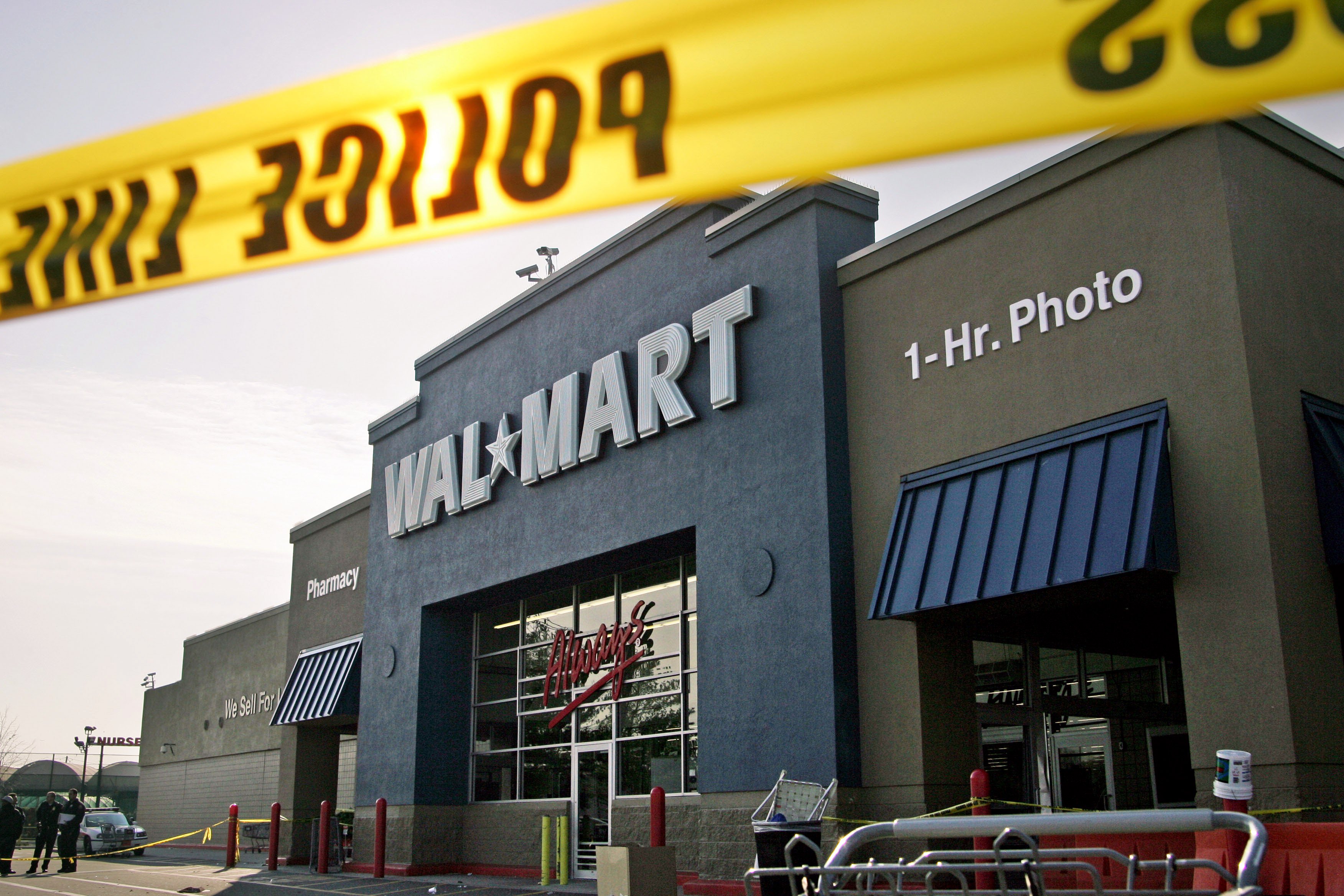 In this Nov. 28, 2008, file photo, Nassau County Police examine the front of the Wal-Mart in Valley Stream, N.Y., where a temporary Wal-Mart worker died after shoppers broke down the doors and trampled him.