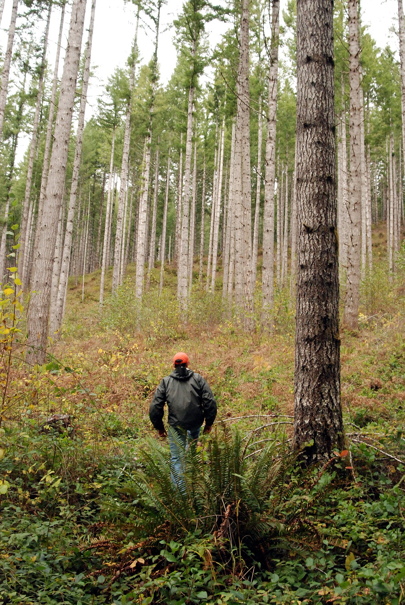 Later Fehrenbacher walked through the forest he manages for the Van Eck Forest Foundation, showing off tall Douglas firs that are breaking into a new growth spurt after trees around them were cut to let in more sun, dead logs with mushrooms sprouting from them left behind on the forest floor, and hemlock seedlings planted next to stumps left from logs sold for lumber.