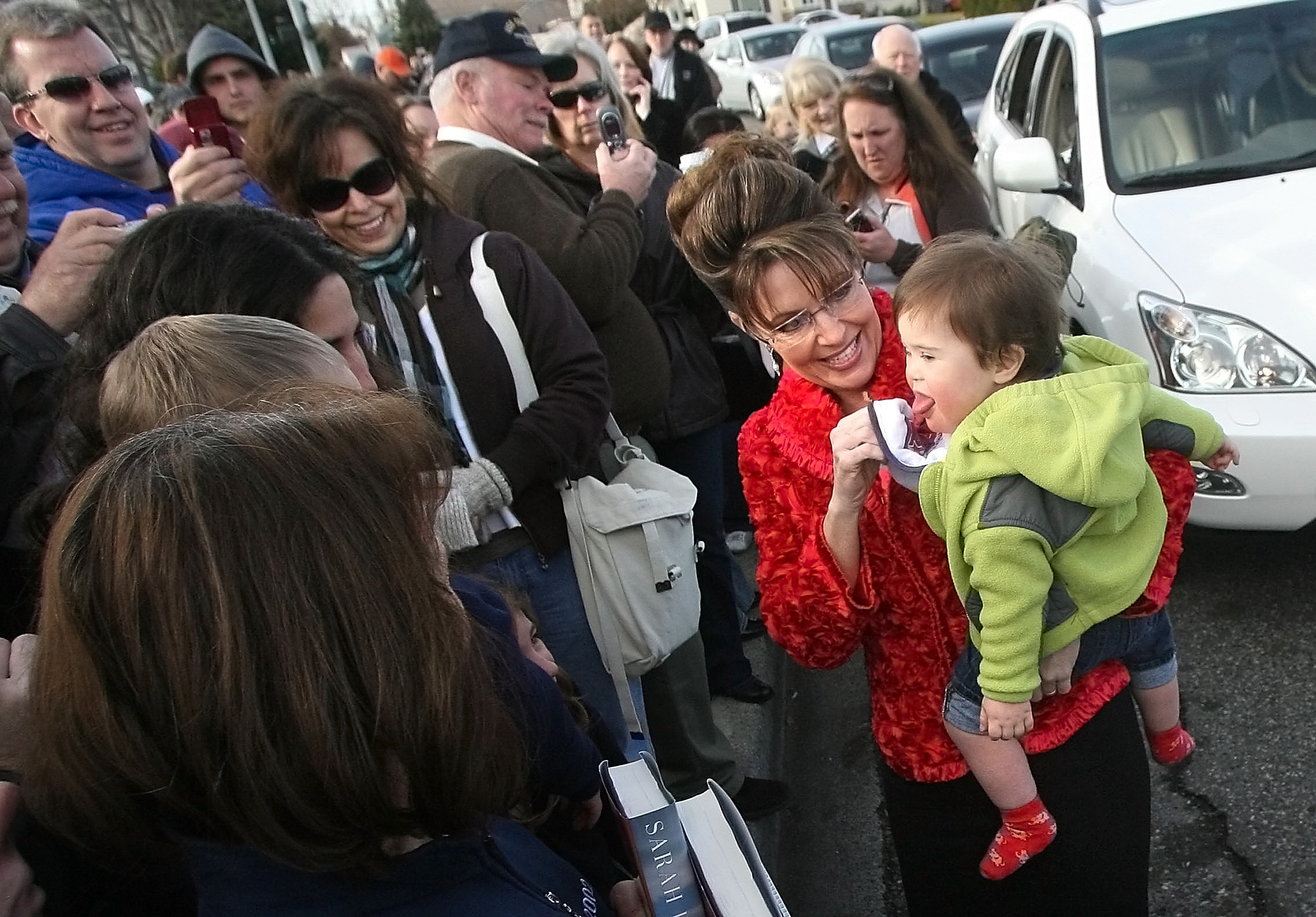 Sarah Palin greets a crowd with her son Trig as she makes an appearance to sign copies of her book “Going Rogue” at Hasting book store in Richland, Wash. on Sunday. Thousands showed up for Palin’s book signing in the Tri-Cities. (AP Photo/Tri-City Herald, Paul T. Erickson)