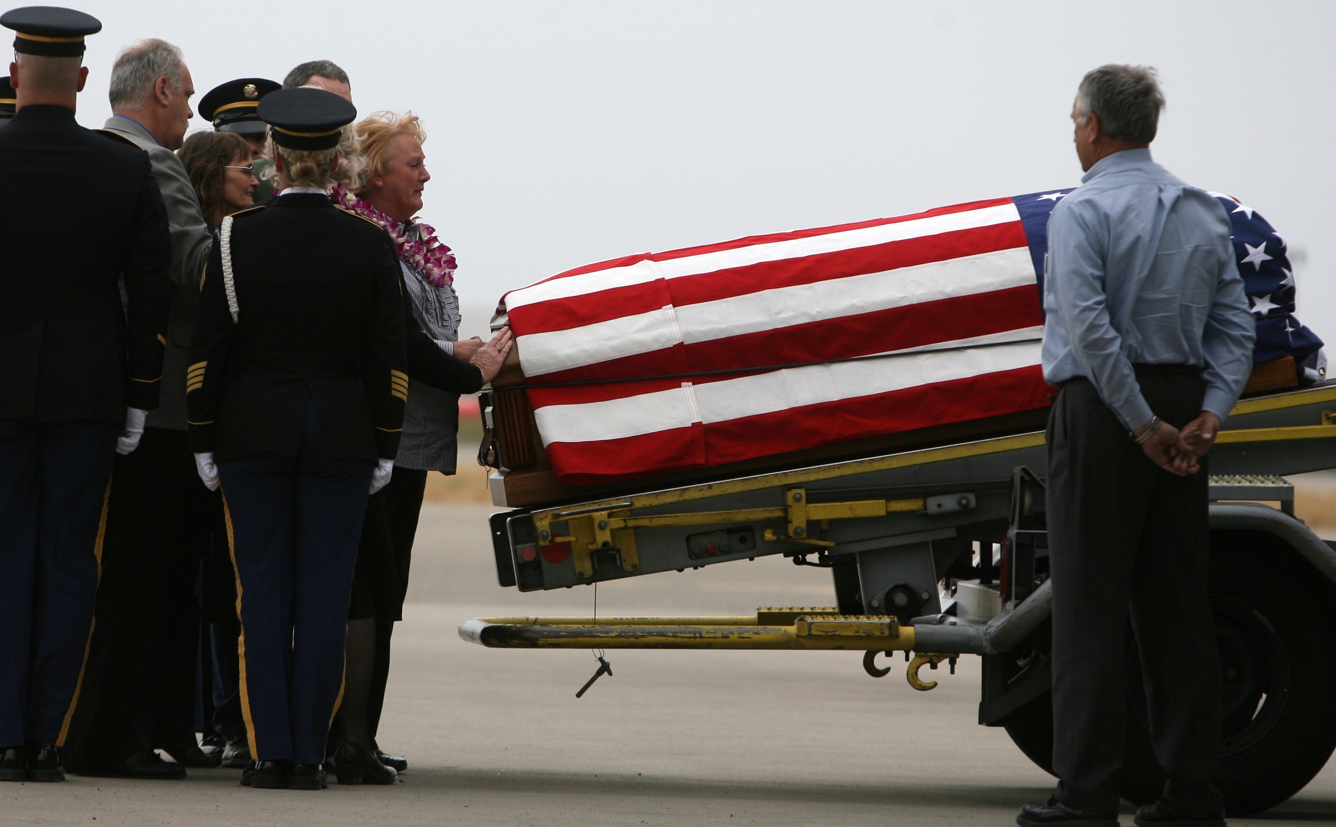 The Phelps family including matriarch Dee Phelps joins her children Ron, Jeff, Dan and Lori, as they welcome her husband, Chief Warrant Officer Don Phelps’s remains on a flight from Hawaii at the Boise Airport Tuesday. Phelps died in 1965 when his helicopter disappeared over the mountains of southern Vietnam. (AP Photo/Idaho Statesman, Shawn Raecke)