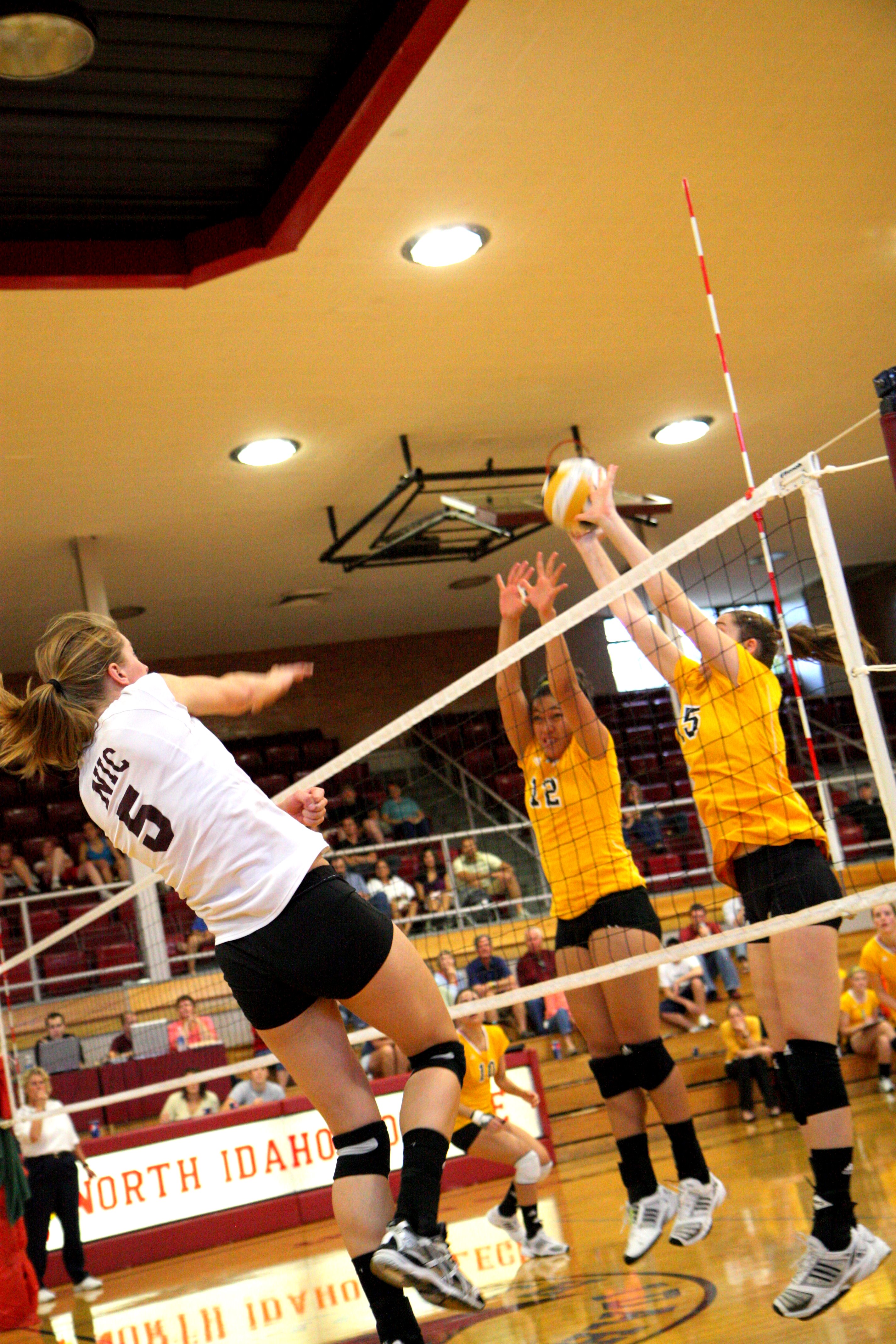 Don Sausser points out that 6-foot-2 Abree Chesnut (No. 5) is one reason why North Idaho College volleyballers are rated No. 1 in the nation. Here, Abree fires one through the hands of CSI blockers.