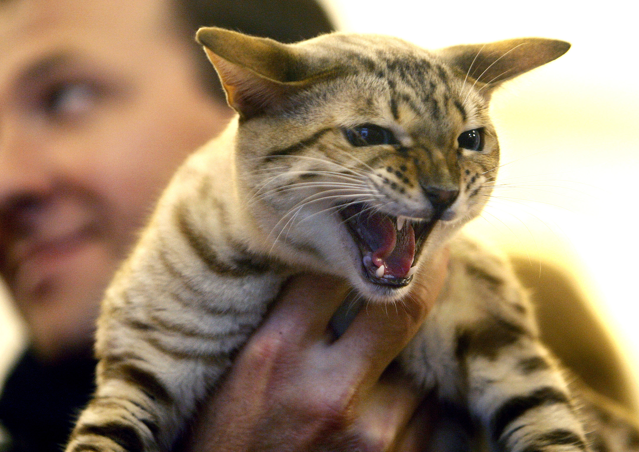 A Bengal cat reacts to a judge during an international feline beauty contest in Bucharest, Romania Saturday.(AP Photo/Vadim Ghirda)