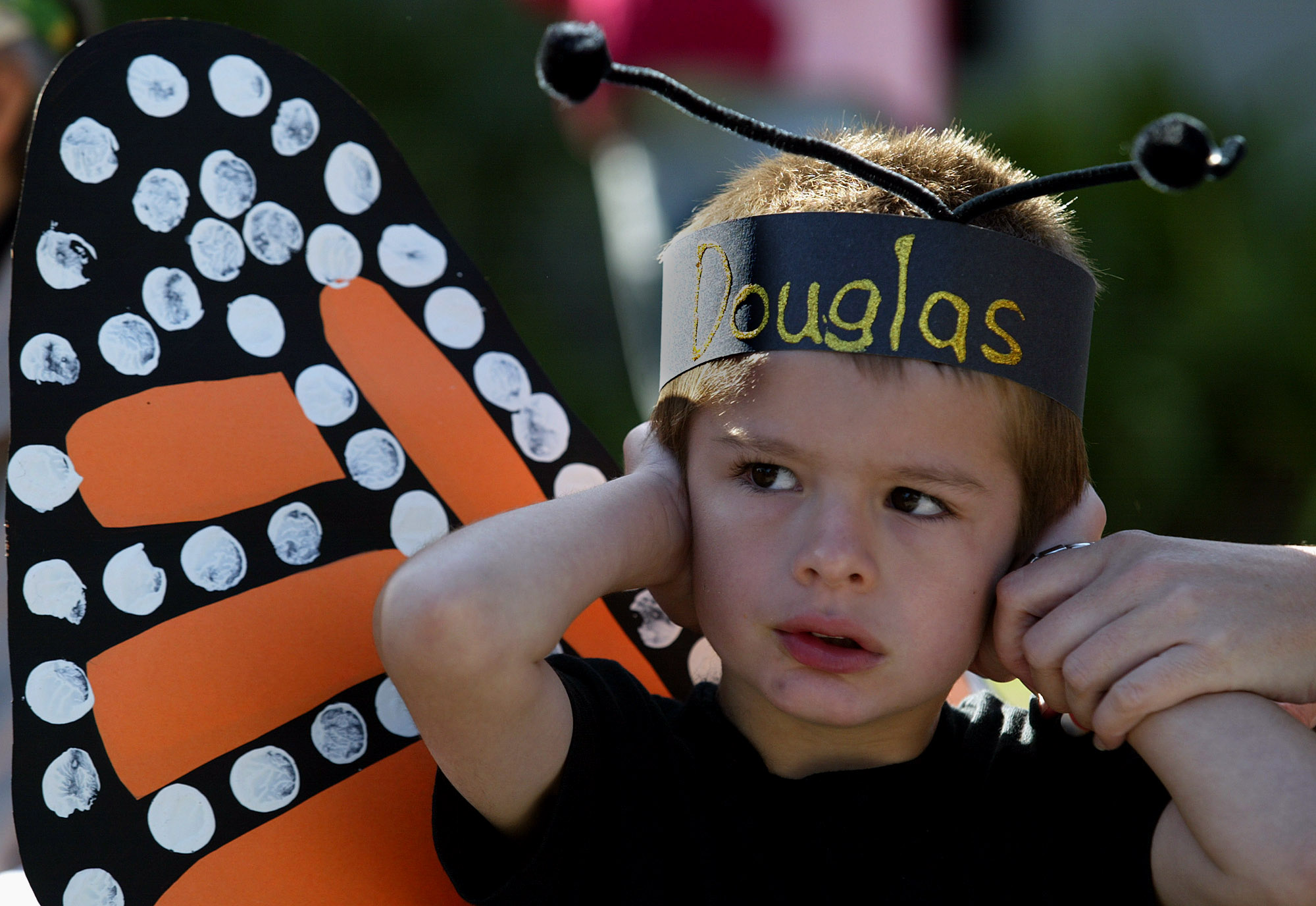 Douglas Pottharst, 5, puts his hands over his ears as the band played and marched by as he participated in Pacific Grove Butterfly Parade in Pacific Grove, Calif., on Saturday. (AP Photo/Monterey County Herald, Orville Myers)