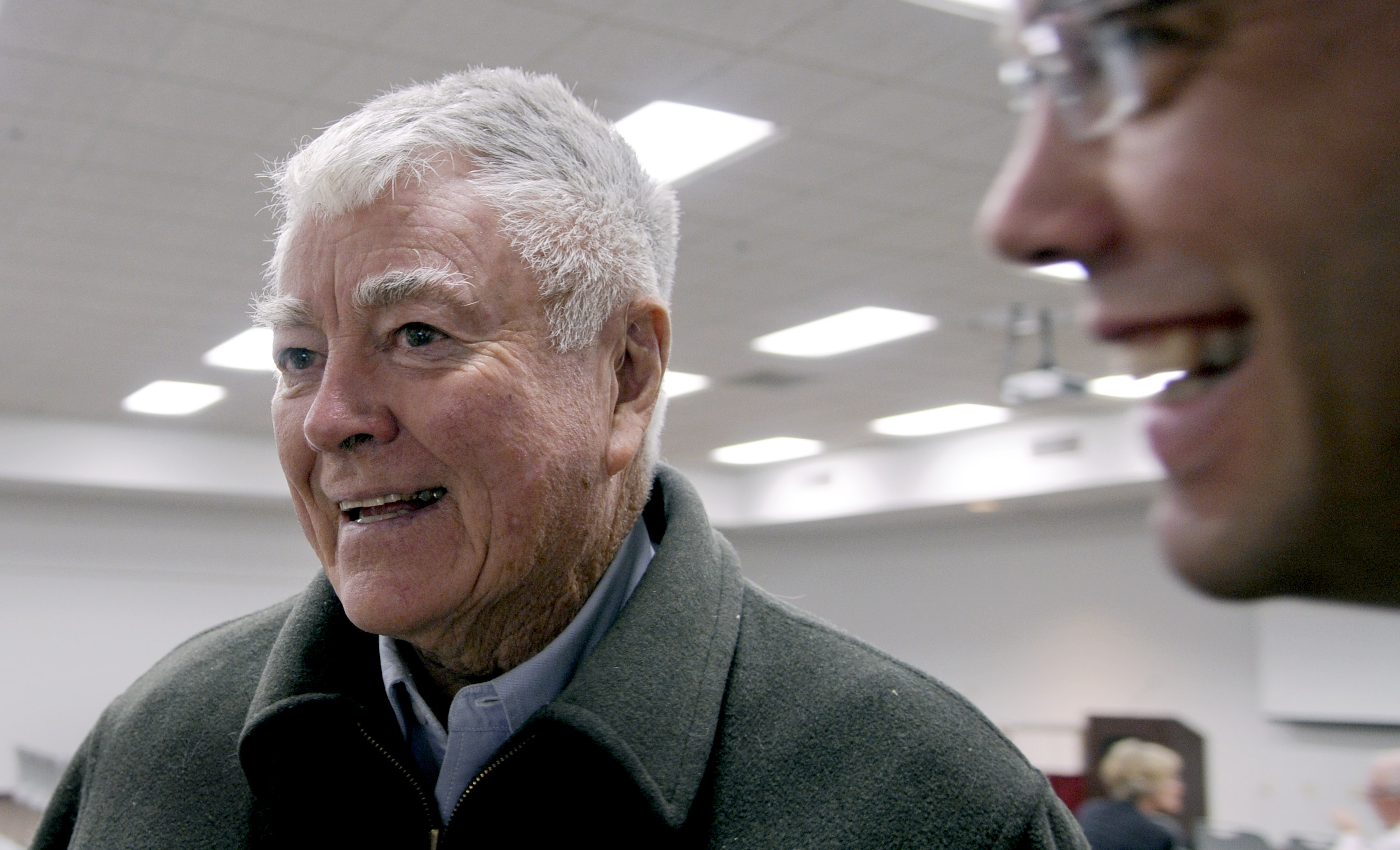 Pete McCloskey, left, former California congressman who co-authored the Endangered Species Act and co-founded Earth Day shared a laugh with Rocky Owens, right, of the Human Rights Education Institute before giving a talk at North Idaho College in Coeur d’Alene on Tuesday. (Kathy Plonka/SR)