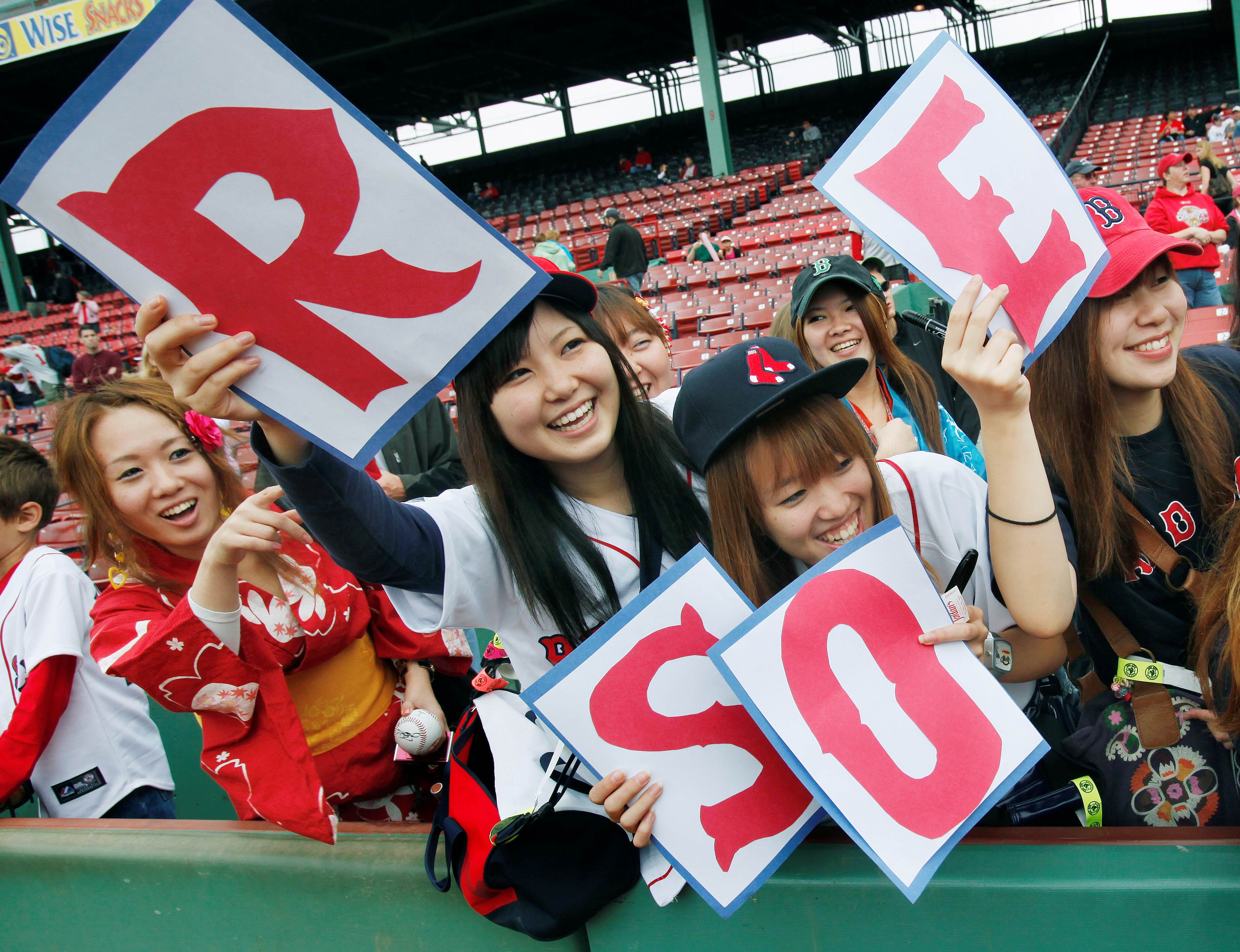 Students from Tokyo who are studying in Boston, from left, Marina Arai, Hiromi Kuki, Emiri Imanishi and Sakiki Ikeda, try to get the attention of Boston Red Sox players during warm-ups before the start of a baseball game between the Cleveland Indians and the Red Sox Sunday in Boston. (AP Photo/Michael Dwyer)