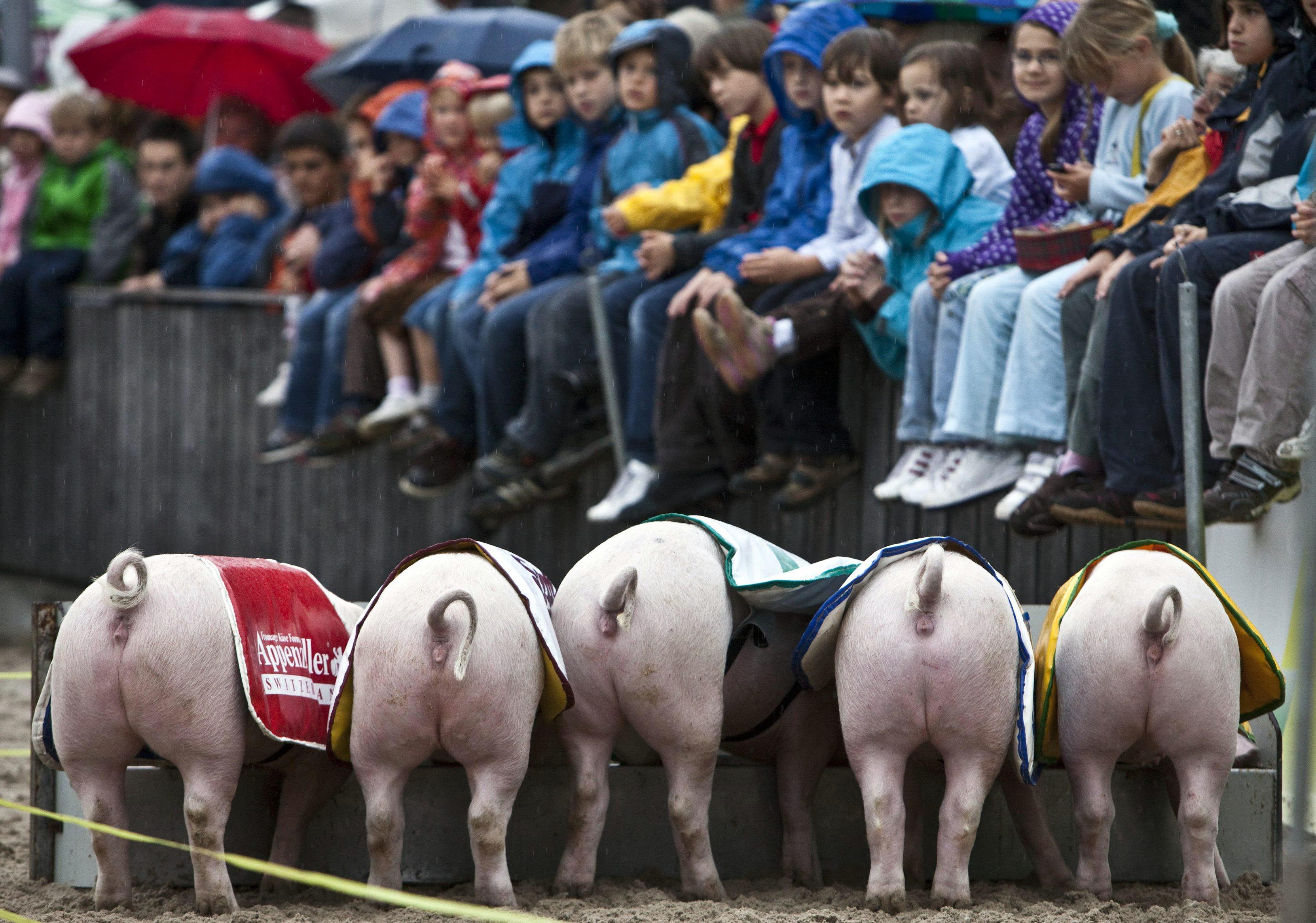Spectators watch piglets at the feeding trough, after a traditional pig race at the Swiss agriculture fair OLMA, in St. Gallen, Switzerland, earlier today. (AP Photo/Keystone, Ennio Leanza)