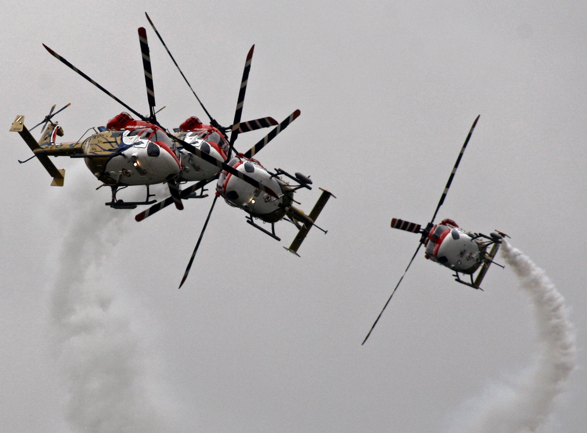 Advanced Light Helicopters of the Indian Air Force (IAF) perform aerobatics at the rehearsal of the IAF Day Parade in New Delhi, India, Tuesday. The 77th anniversary of IAF was celebrated today. (AP Photo/Mustafa Quraishi)