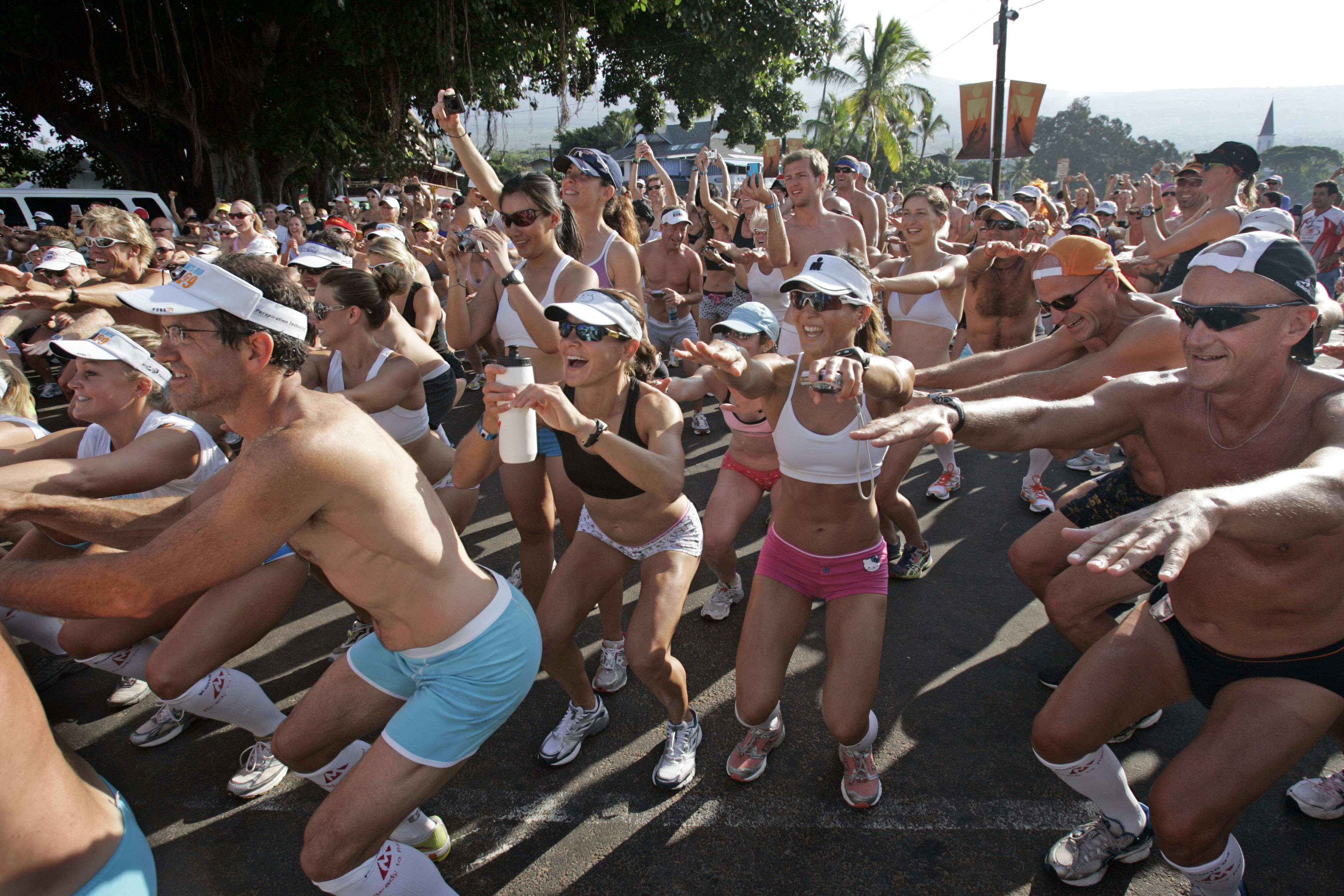 Ironman triathlon competitors, visitors and locals do group calisthenics in their underwear as they participate in the annual Underpants Run Thursday in Kailua-Kona, Hawaii. The Ironman World Championship is scheduled for Saturday. (AP Photo/Chris Stewart)