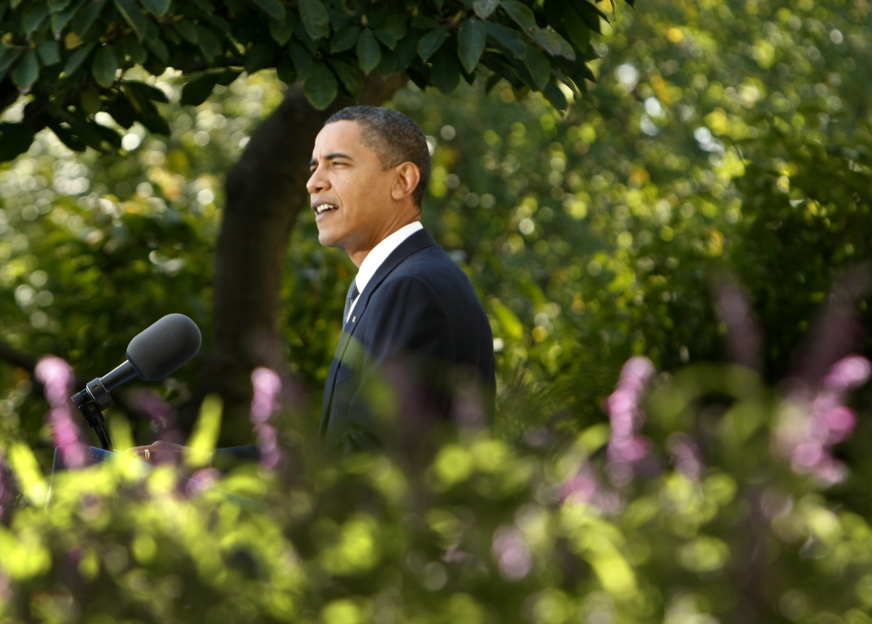 President Barack Obama makes remarks in the Rose Garden of the White House in Washington this morning about him being awarded the Nobel Peace Prize. (AP Photo/Gerald Herbert).