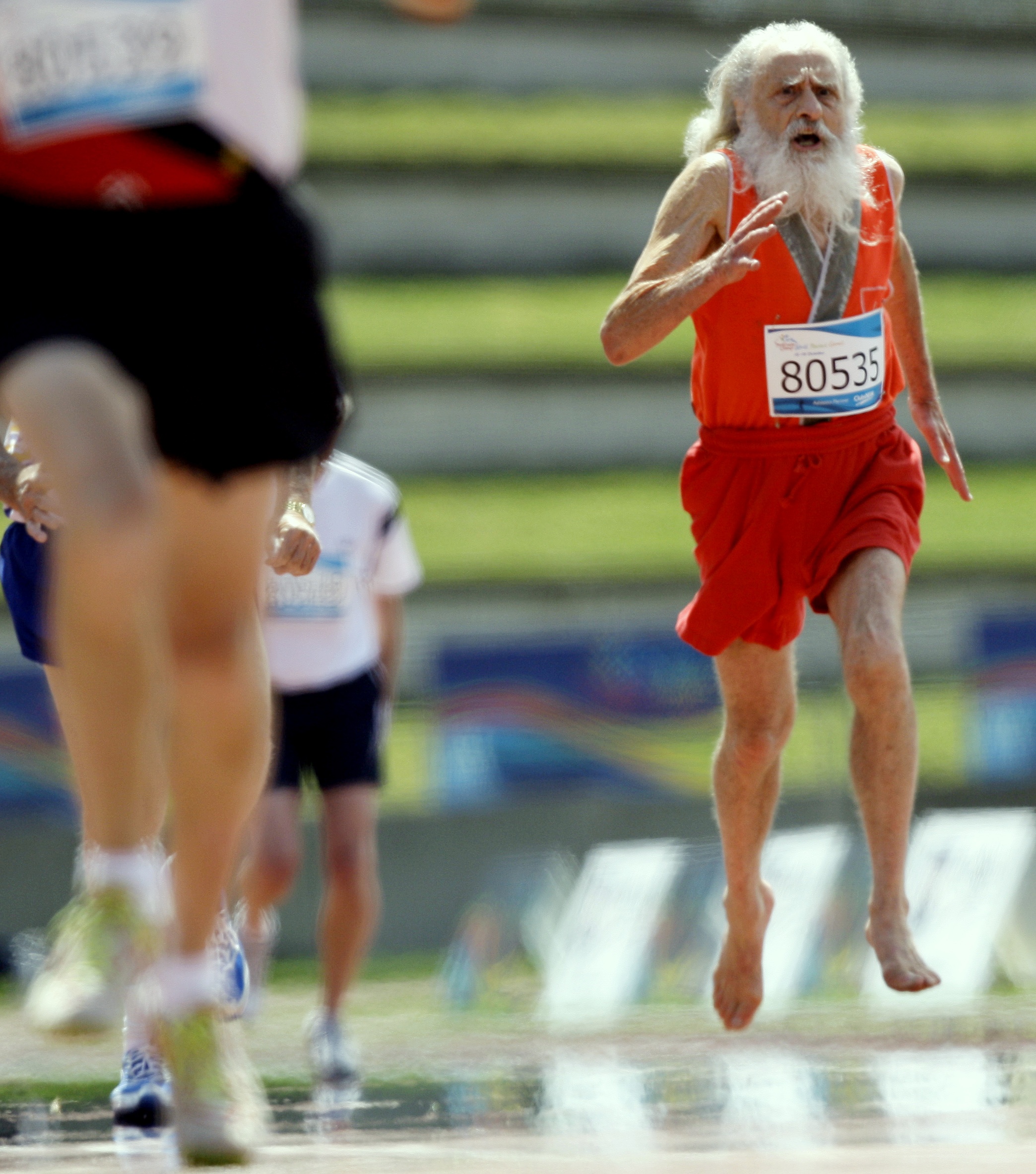 Santa O Clause from Australia runs in bare feet in the heats of the 80-84 year-old class of the men’s 100 meters during the Masters Games, in Sydney, Australia, Sunday. (AP Photo/Rick Rycroft)