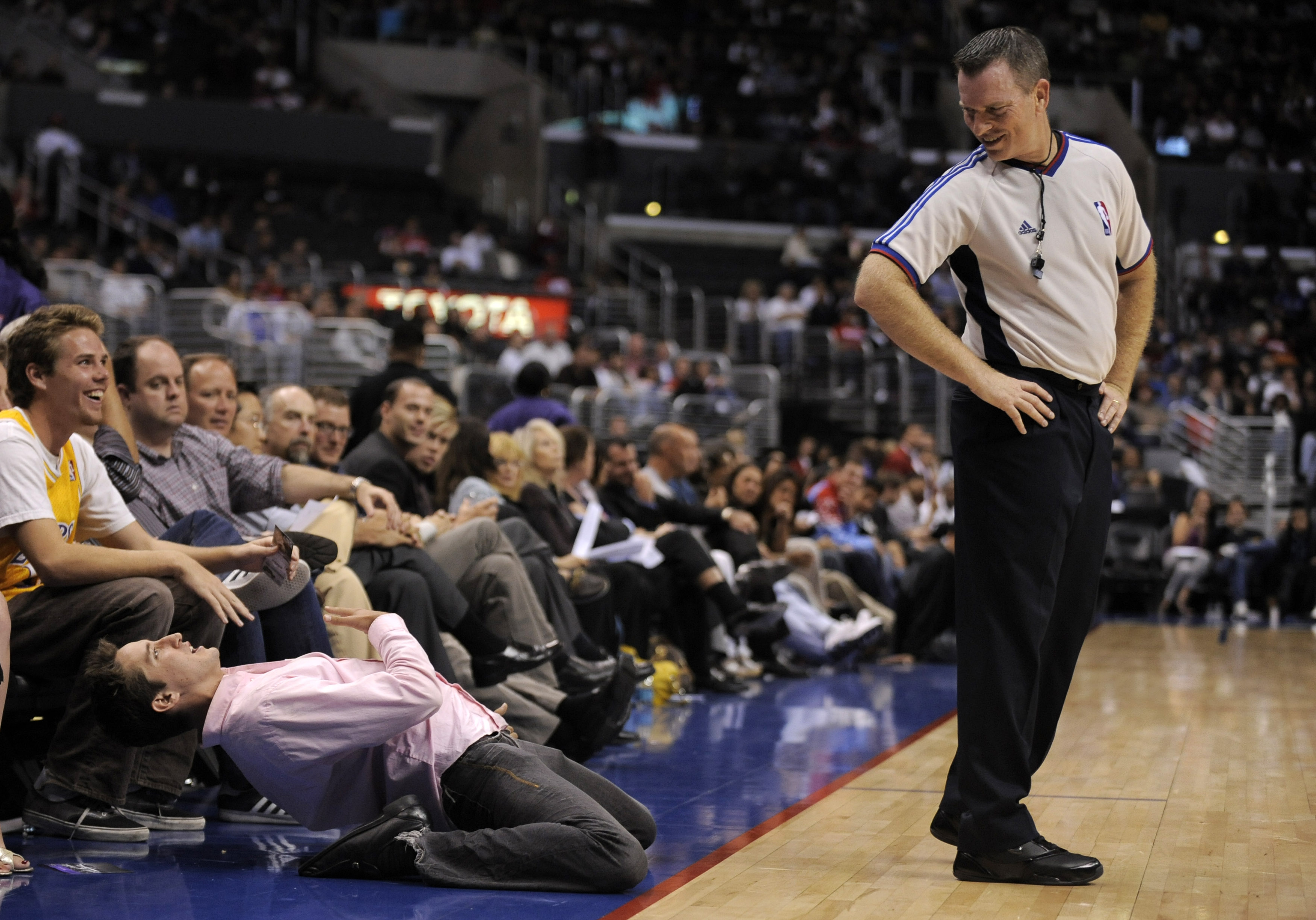 Referee Kurt Walker, right, turns back as an unidentified fan dances on the sidelines during the second half of a pre-season NBA basketball game between the Golden State Warriors and Los Angeles Clippers in Los Angeles Monday. You write the cutline. (AP Photo/Chris Pizzello)